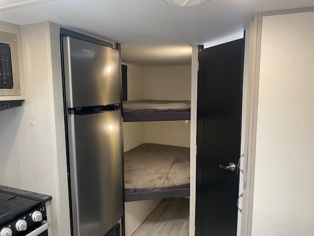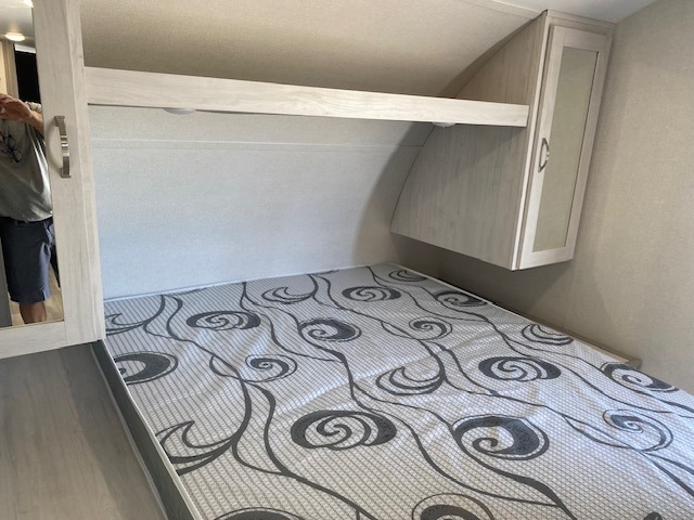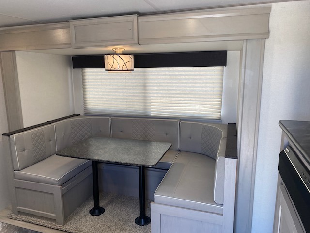 Camping with your friends and family can be comfortable and fun when you have this trailer! From the rear double-size bunks next to the full bathroom to the queen bed up front with a partial wall for added privacy, everyone will have their own space. And the U-shaped dinette slide out offers extra floor space and elbow room, and the kitchen offers full amenities including an L-shaped counter with kitchen sink to keep everything clean. And don't forget about all the storage inside and outside, plus the 19' power awning creates a protected outdoor living area.