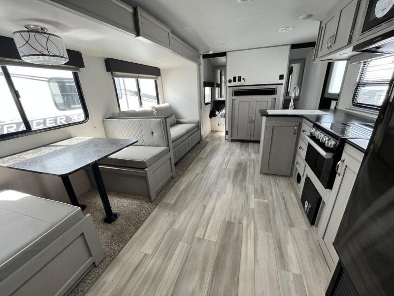 If you are looking for a trailer with double-size bunks and a private bedroom, you have found it, plus the Tracer LE has many more features you will want on your next camping trip! The queen bed and two wardrobes are behind a partial wall with solid doors for added privacy. The double-size bunks are in the rear corner next to the full bathroom for convenience for the kids or your guests. And the L-shaped counter with kitchen sink and full amenities sets up the cook nicely to be able to make meals for everyone. And you will love the extra floor space created by the booth dinette and sofa slide out.