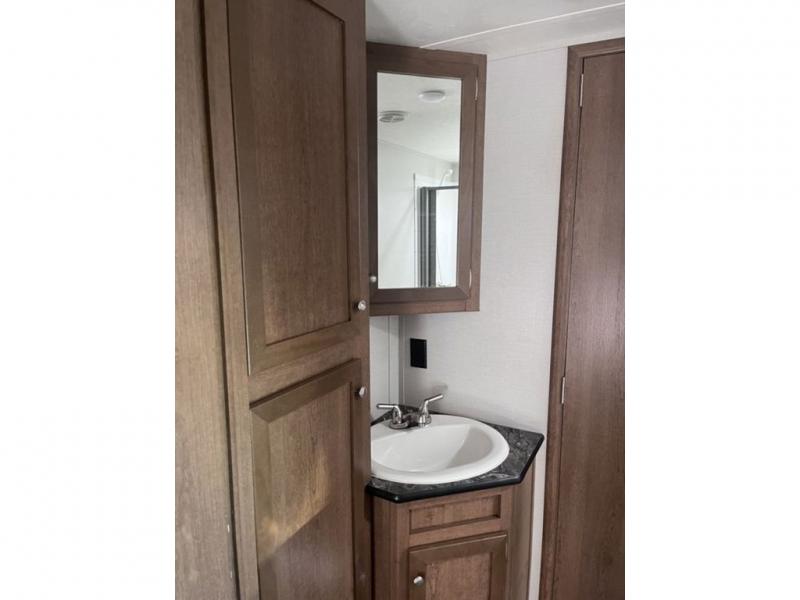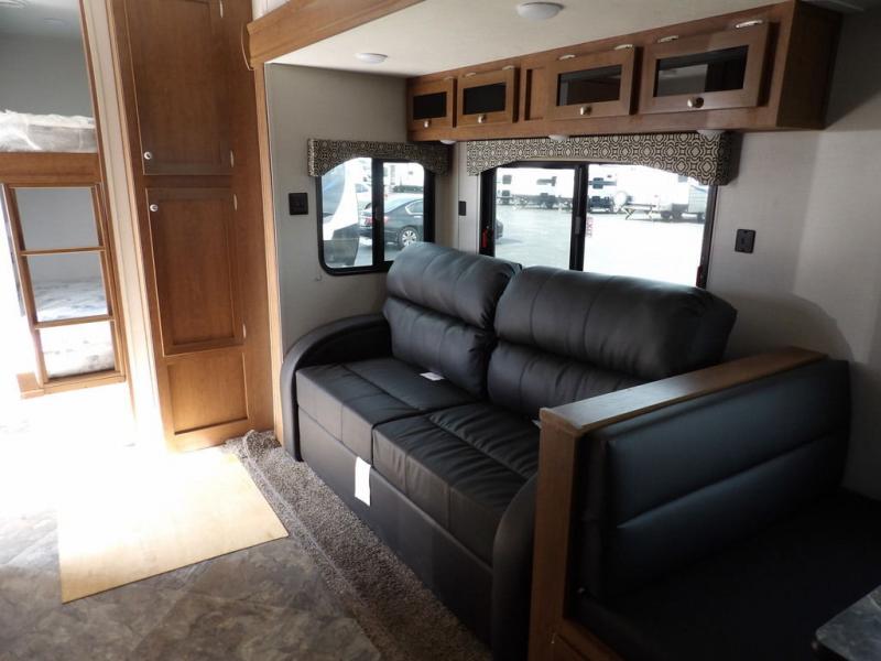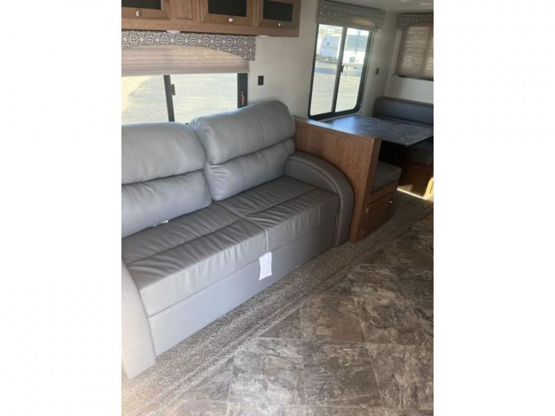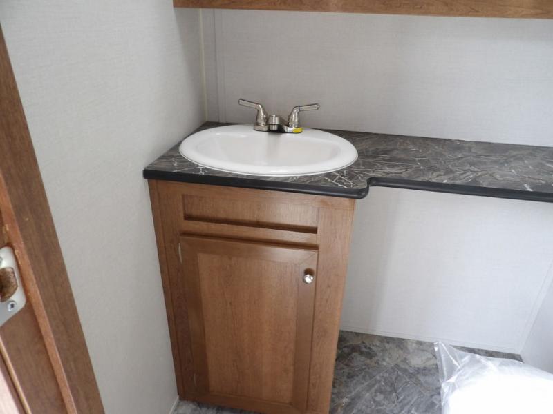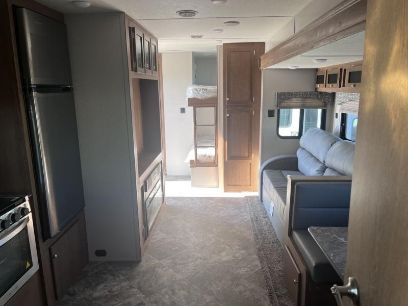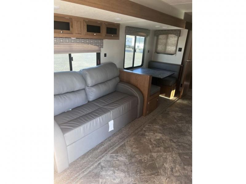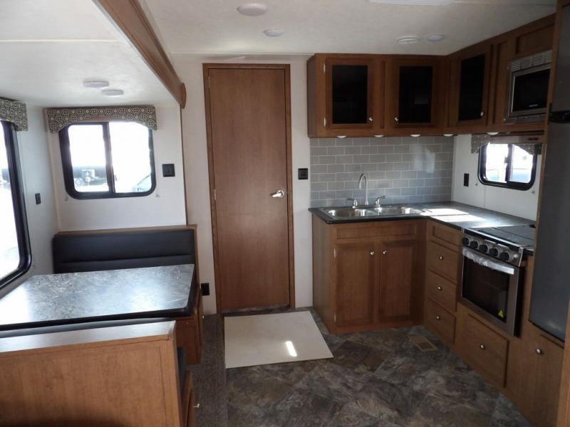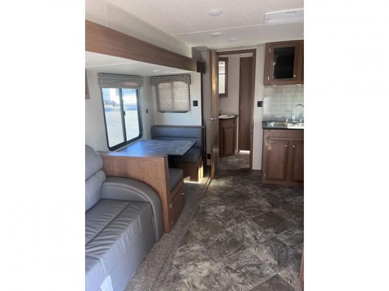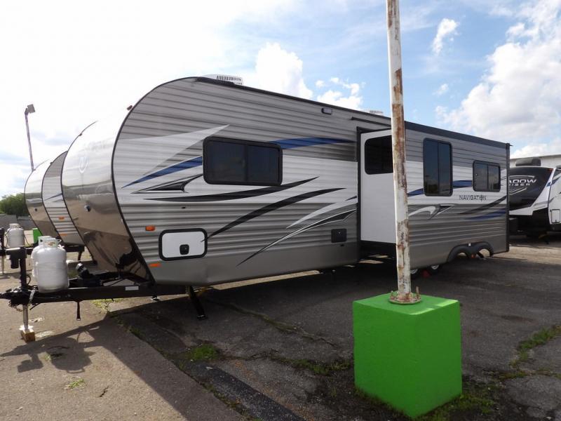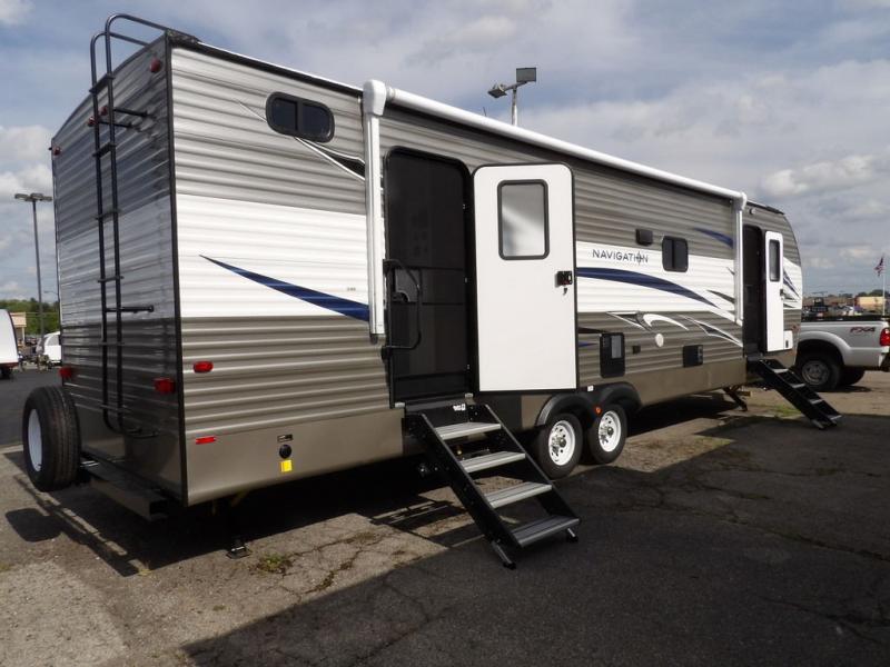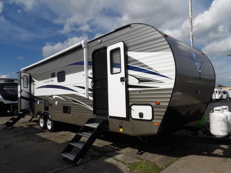 If you've been looking for a travel trailer with a spacious interior and plenty of sleeping options, look no further than this Navigation unit. The large slide out will allows the kids ample space to play a game on the floor or wrestle with the dog, while the adults relax on the tri-fold sofa or booth dinette. The walk-through bath includes a shower with a seat for comfort, and from here you can access the front private bedroom that features a walk-around king bed. Your guests can sleep on the rear corner 42" x 72" bed that is conveniently located right next to the half bath. Don't worry about leaving anything behind since this model includes plenty of storage space, including a walk-in pantry, overhead cabinets, plus a pass-through storage and outside trunk storage for fishing poles, tools, and the kids' scooters!