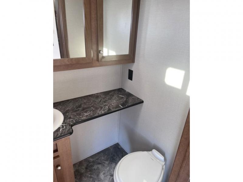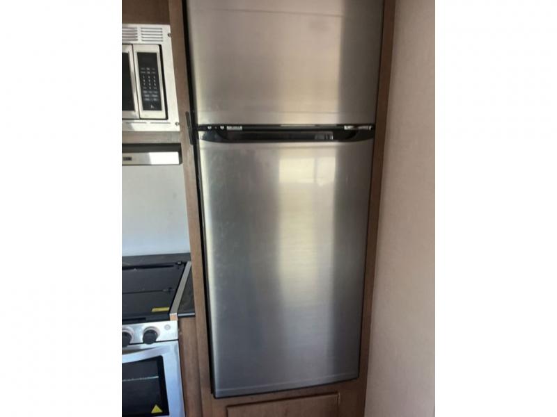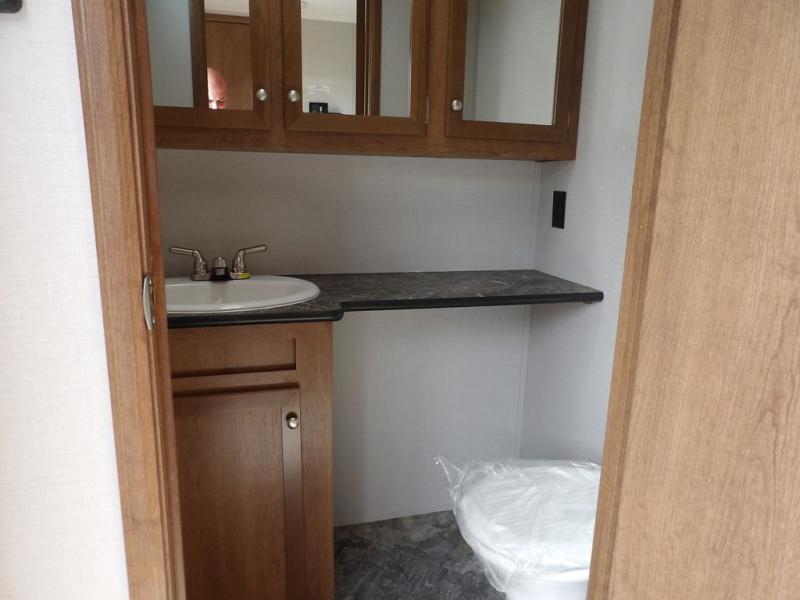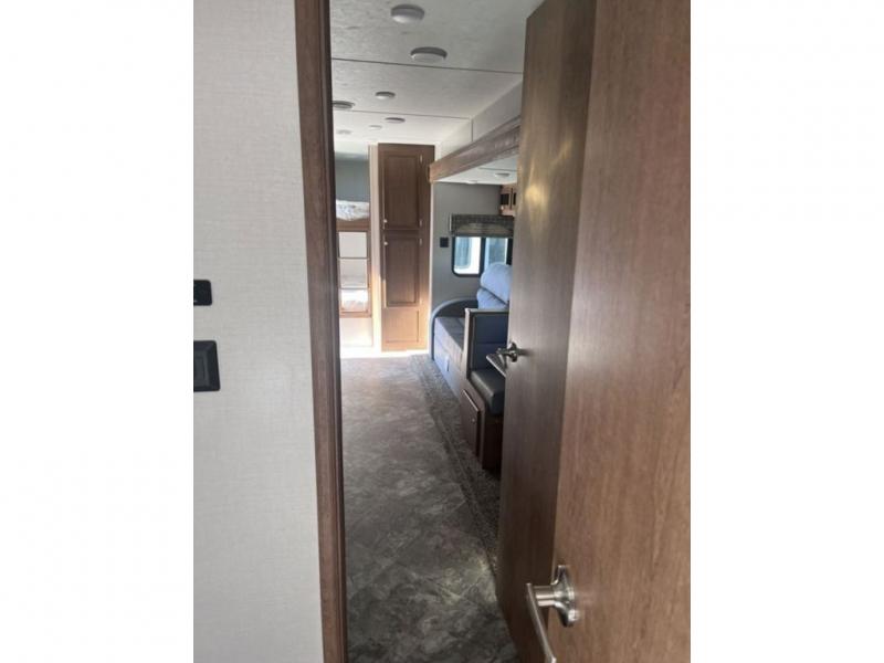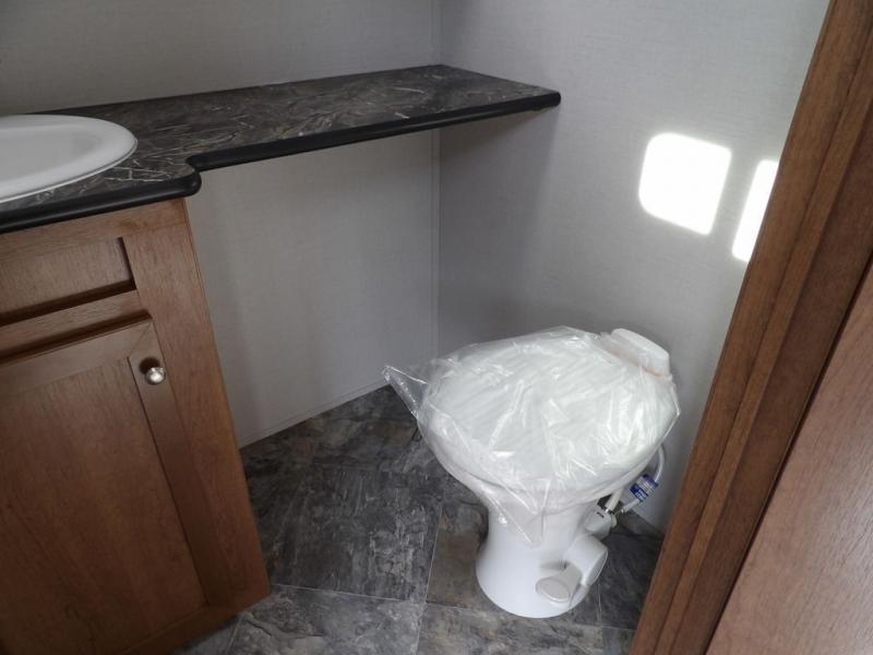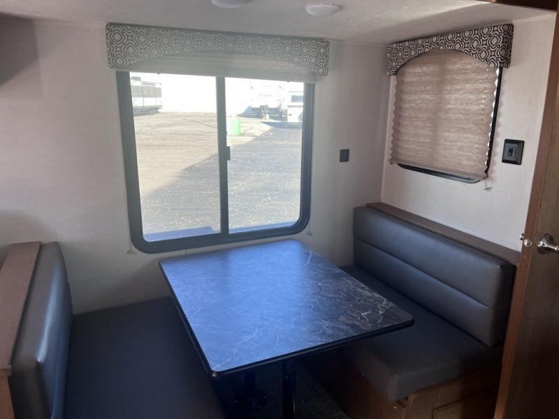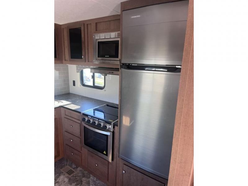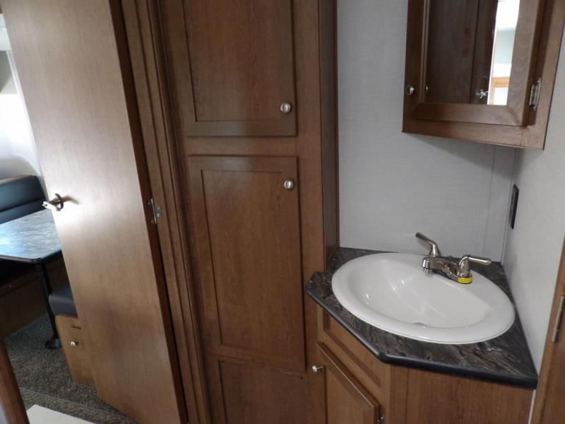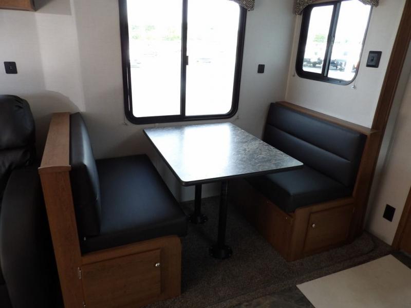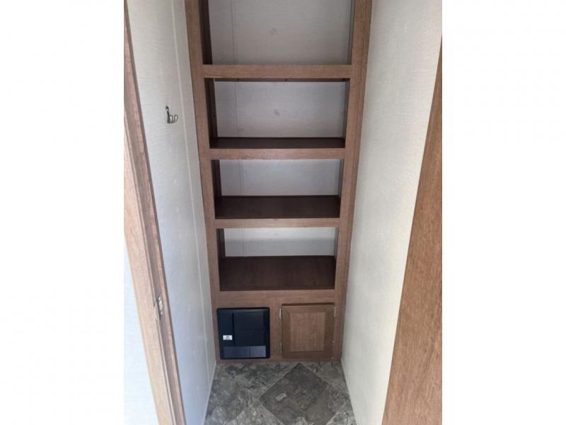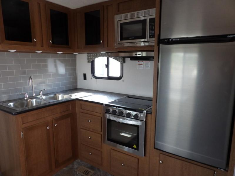 If you've been looking for a travel trailer with a spacious interior and plenty of sleeping options, look no further than this Navigation unit. The large slide out will allows the kids ample space to play a game on the floor or wrestle with the dog, while the adults relax on the tri-fold sofa or booth dinette. The walk-through bath includes a shower with a seat for comfort, and from here you can access the front private bedroom that features a walk-around king bed. Your guests can sleep on the rear corner 42" x 72" bed that is conveniently located right next to the half bath. Don't worry about leaving anything behind since this model includes plenty of storage space, including a walk-in pantry, overhead cabinets, plus a pass-through storage and outside trunk storage for fishing poles, tools, and the kids' scooters!