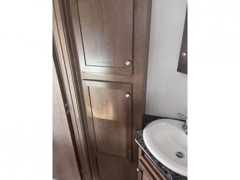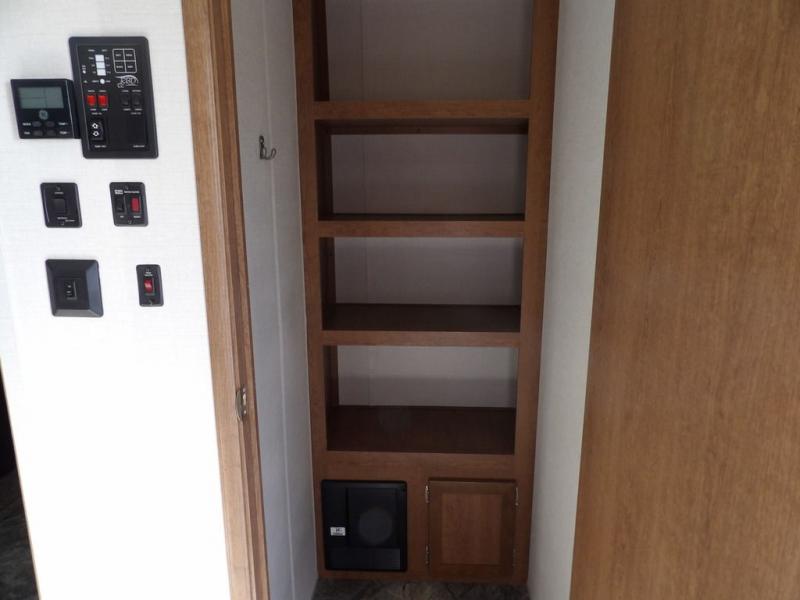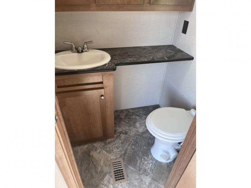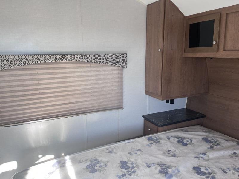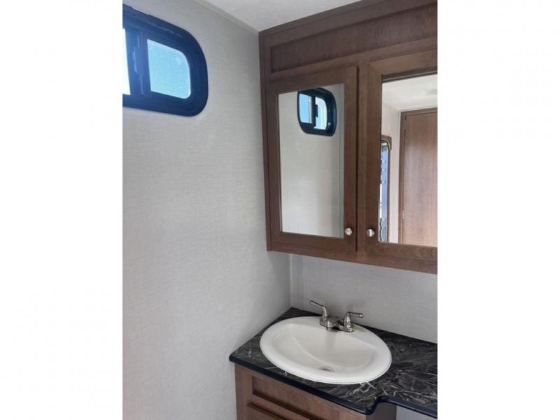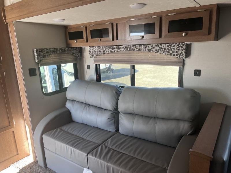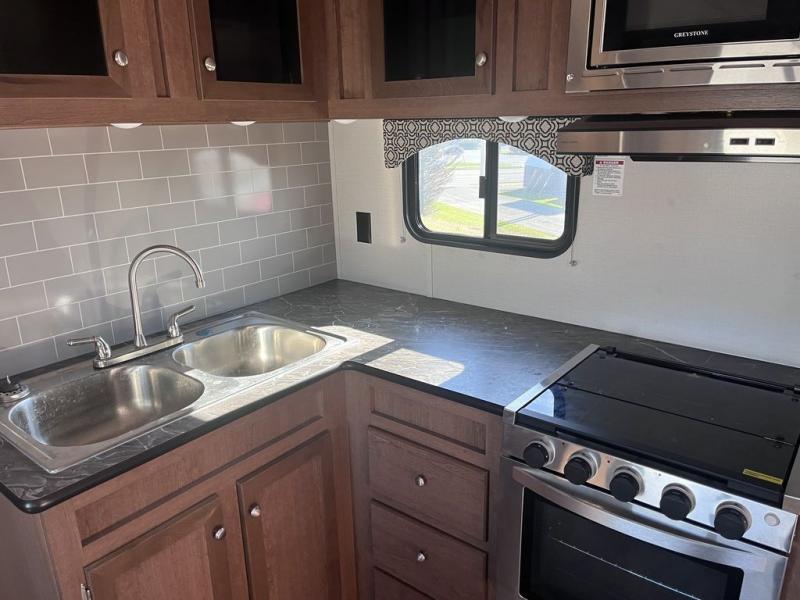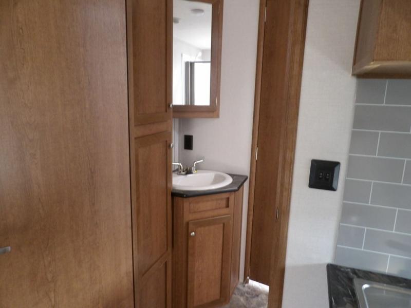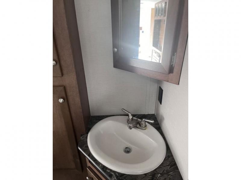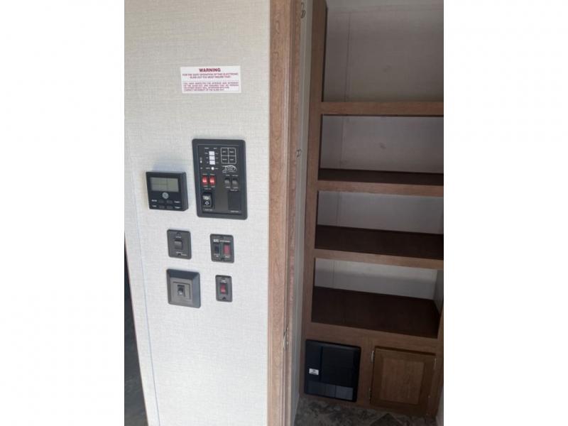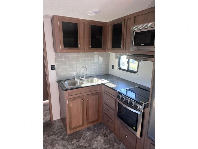 If you've been looking for a travel trailer with a spacious interior and plenty of sleeping options, look no further than this Navigation unit. The large slide out will allows the kids ample space to play a game on the floor or wrestle with the dog, while the adults relax on the tri-fold sofa or booth dinette. The walk-through bath includes a shower with a seat for comfort, and from here you can access the front private bedroom that features a walk-around king bed. Your guests can sleep on the rear corner 42" x 72" bed that is conveniently located right next to the half bath. Don't worry about leaving anything behind since this model includes plenty of storage space, including a walk-in pantry, overhead cabinets, plus a pass-through storage and outside trunk storage for fishing poles, tools, and the kids' scooters!