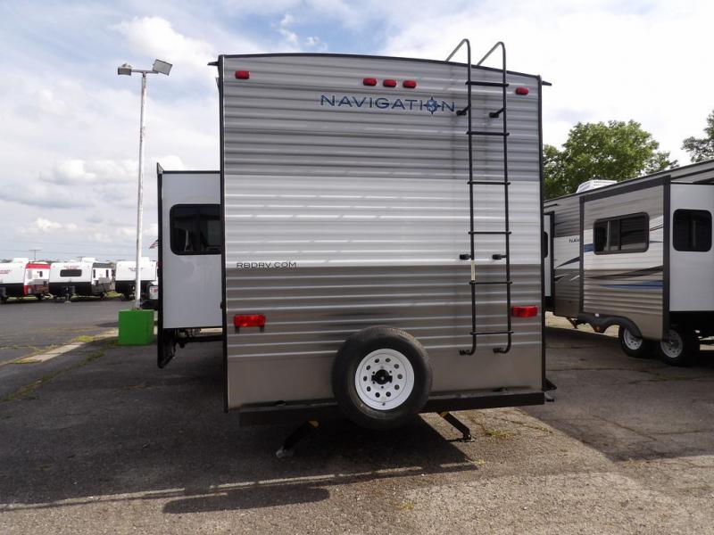 With each Navigation travel trailer by Recreation By Design, you will enjoy up-to-date amenities and quality construction all at an affordable price. The engineered trusses, I-beam super frame with E-Coat corrosion prevention, and aluminum mesa siding provide a strong unit made to last through years of fun and memories. You will find plenty of exterior conveniences, such as Lippert Solid drop-down steps for stability, magnetic compartment door holders, and an outside shower. The inside of each Navigation trailer is made to feel at home with an 84" interior height, residential kitchen backsplash, a king bed with an upgraded innerspring mattress, a one-piece fiberglass shower or tub, plus many more amenities. Your camping experience can be further customized by adding one or more of the many options available, like the electric stabilizer jacks in place of the crank down jacks, the 30" fireplace with a remote, the second 15,000 BTU A/C unit, and more!