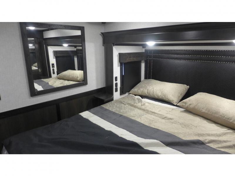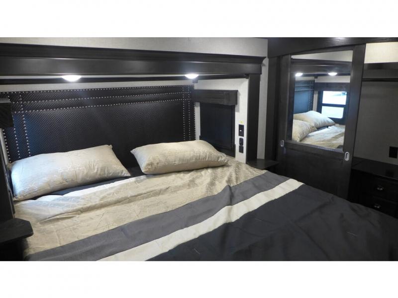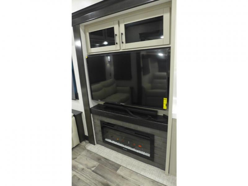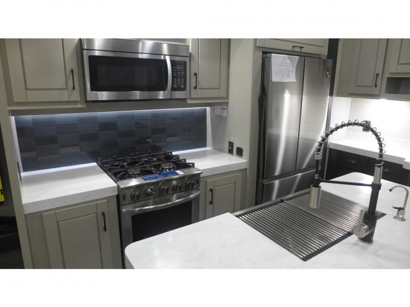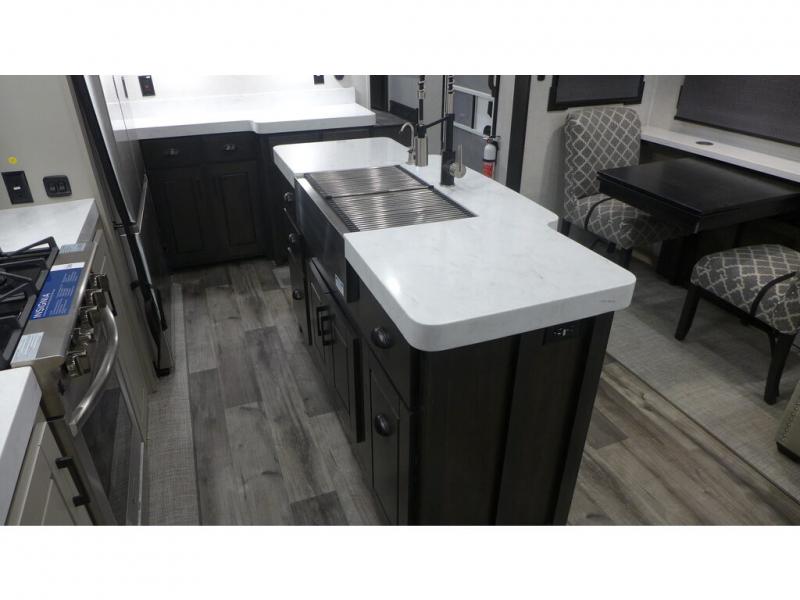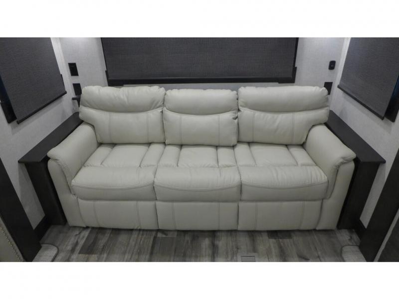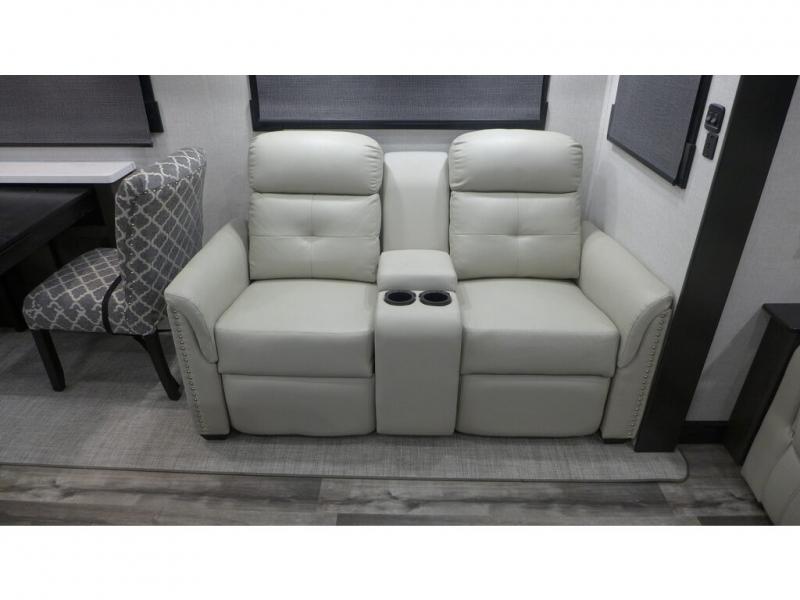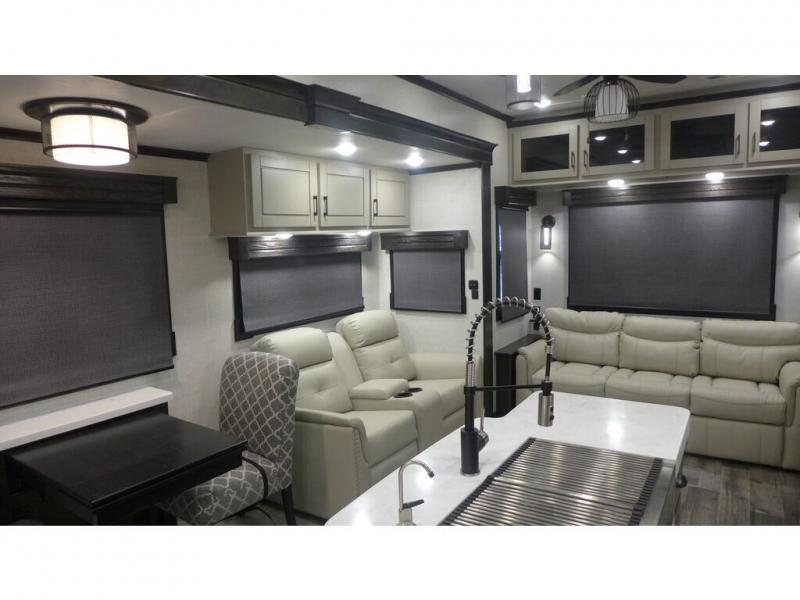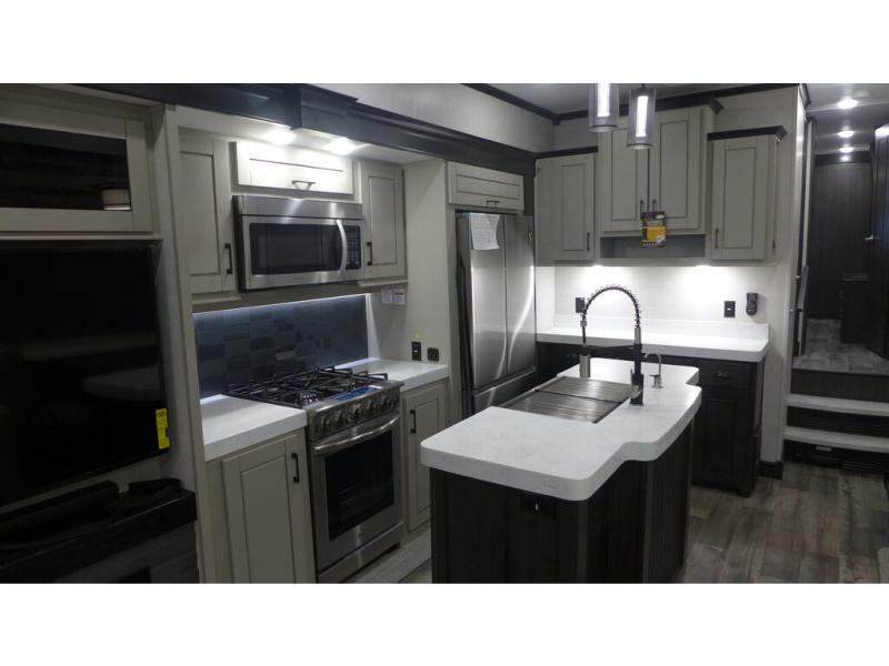 Come make this luxury fifth wheel your home away from home while you camp at your favorite campground! This model features triple slides, a rear living area with a sofa, and theater seats for movie night! Meal prep is a breeze in this residential kitchen. You will love all of the storage space with the residential refrigerator and overhead cabinets. The kitchen island provides extra counter space as well as over-island lighting that will make prepping dinner easier than ever. Head up the stairs and you will find the bathroom that features a domed shower skylight that provides extra standing room. This unit includes a front bedroom with a king bed, plenty of storage with a dresser, a large wardrobe, plus there is a spot for an optional stacked washer and dryer!