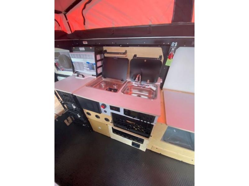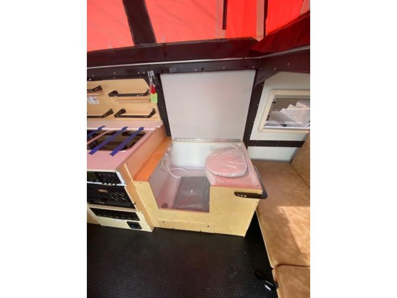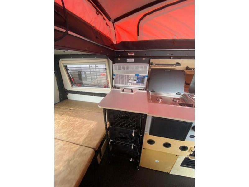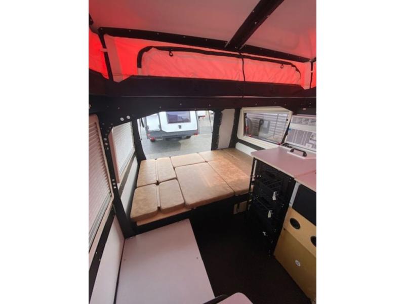 This Mantis travel trailer is perfect for you and your spouse on your next big adventure. You will feel right at home with the full-size bed that includes convenient under-bed storage, and you can invite more friends along by adding the optional folding couch/bunk bed system or the optional rooftop tent. Prepare eggs and bacon on the two-burner stove and easily clean up in the sink. The café table provides a place to dine, or you can enjoy the fresh air outdoors as you sit under the 8' patio awning. This model includes many convenient features, such as a 16-gallon trash can, a rear hatch for access and ventilation, and a storage tower with three milk crates for snacks, flashlights, and the first-aid kit! You can even choose to add the optional wet bath with a cassette toilet and a shower to stay clean throughout your whole trip!