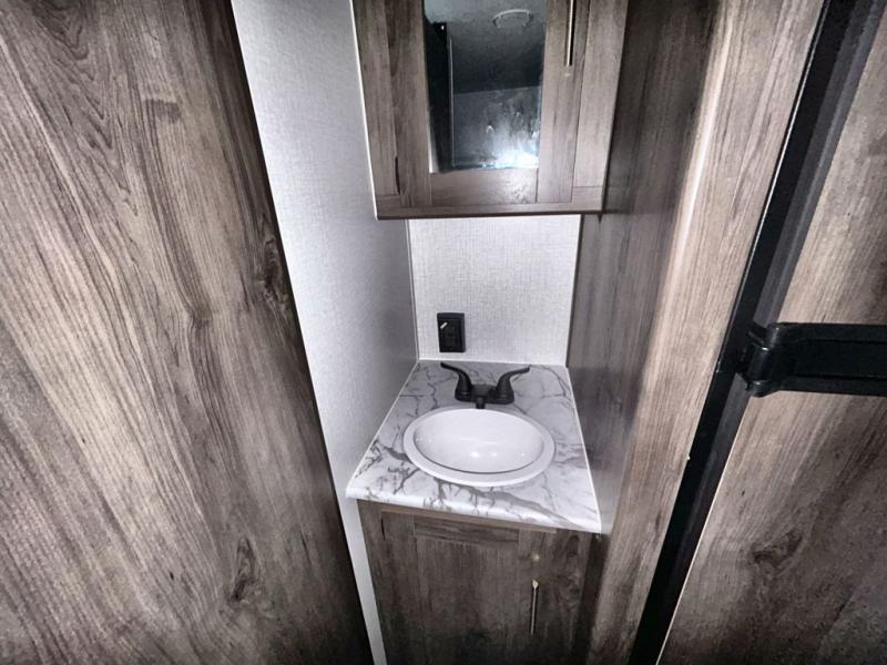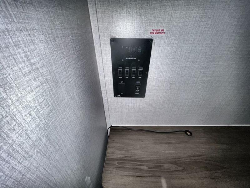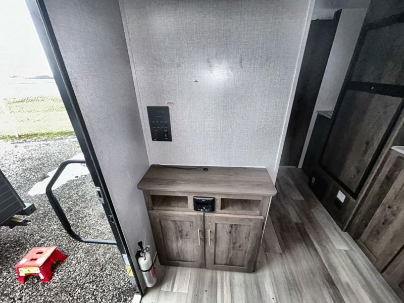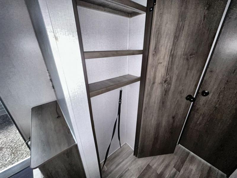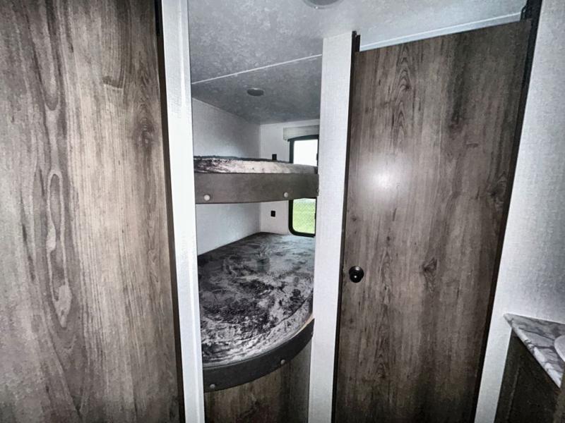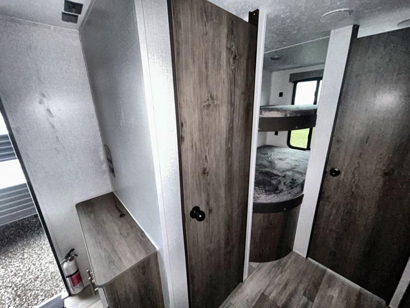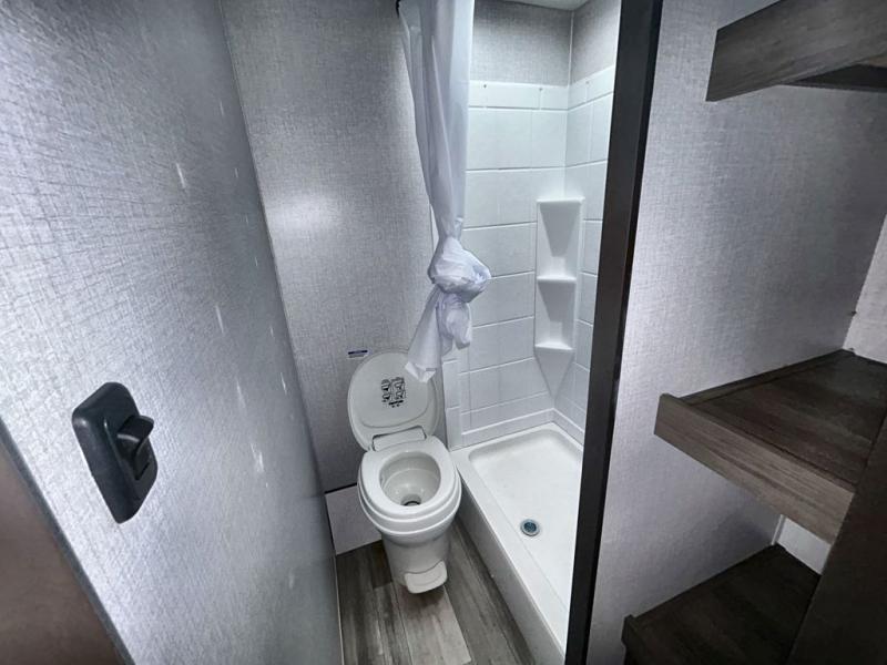 You and your family or friends will experience versatile living with a front Murphy bed located behind the U-shaped dinette with a free-standing table, and the bed can be pulled down after you have enjoyed your dinner and played a few card games at the dinette. And the kids or your guests will love the bunk beds! There is a private shower and toilet room which includes a linen closet to keep your towels, plus the vanity is just outside of the bathroom for your convenience. The kitchen offers full amenities, plus a pantry with upper bunk storage, and the cook can make meals using the outside kitchen as well.
