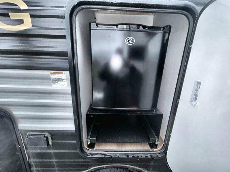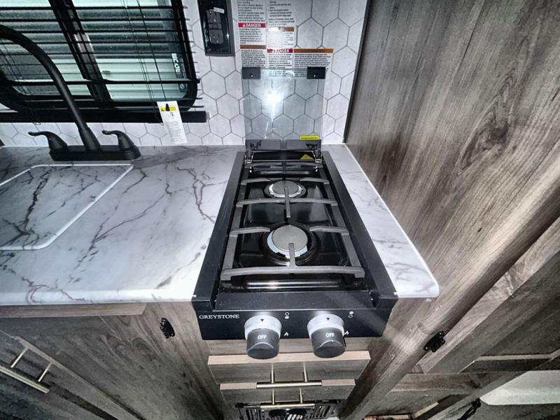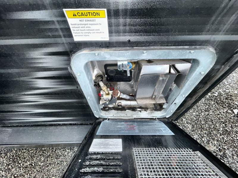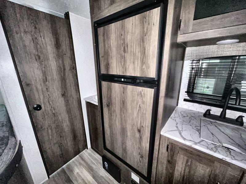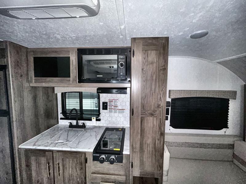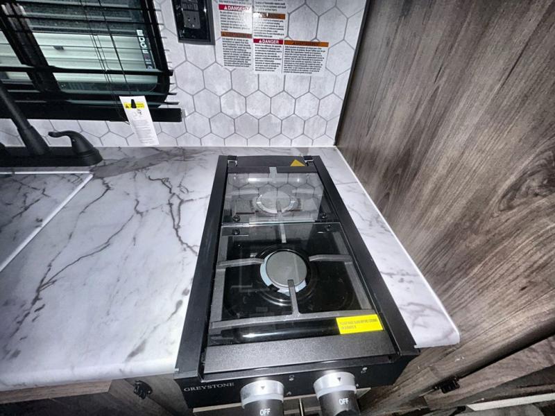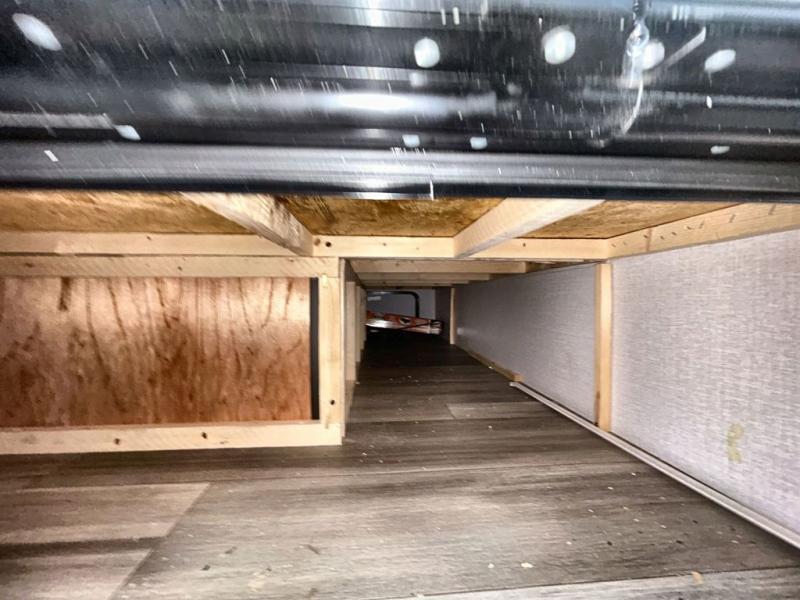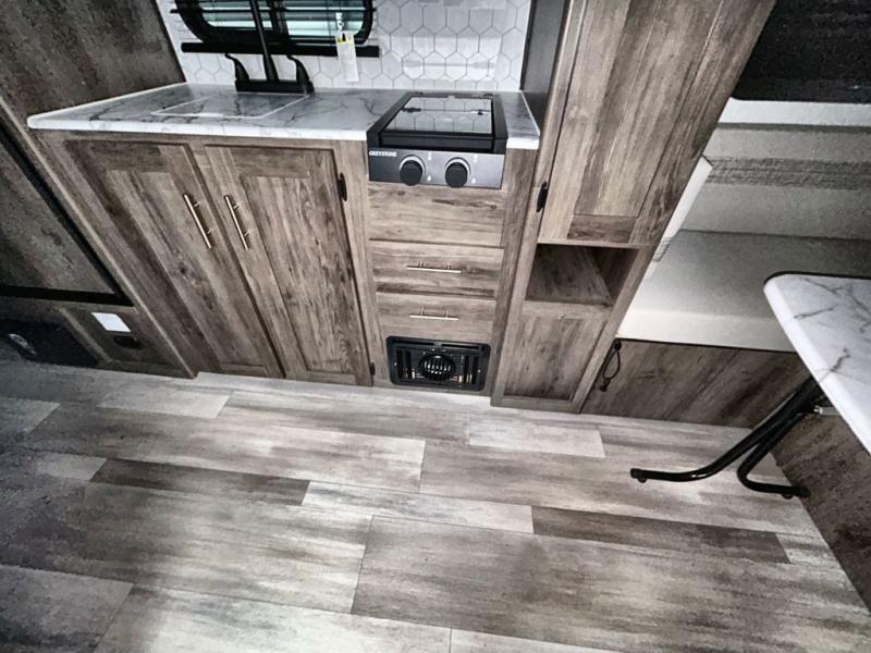 You and your family or friends will experience versatile living with a front Murphy bed located behind the U-shaped dinette with a free-standing table, and the bed can be pulled down after you have enjoyed your dinner and played a few card games at the dinette. And the kids or your guests will love the bunk beds! There is a private shower and toilet room which includes a linen closet to keep your towels, plus the vanity is just outside of the bathroom for your convenience. The kitchen offers full amenities, plus a pantry with upper bunk storage, and the cook can make meals using the outside kitchen as well.