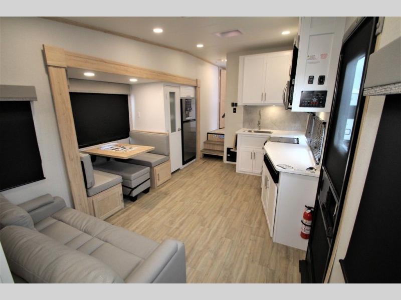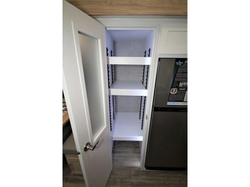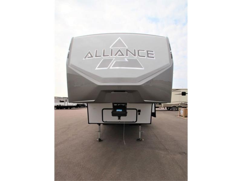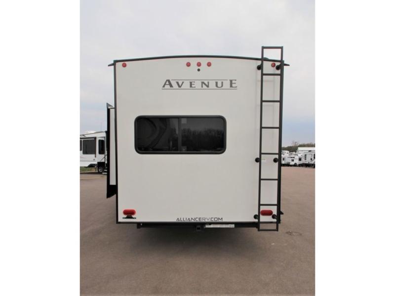 A benchmark chassis creates a space saver upper deck with each one of these Avenue fifth wheels by Alliance RV! The 101 in. wide-body construction gives you more room to walk around and the flush slide out floors throughout prevent any tripping. There are Azdel composite sidewalls inside and out, and a seamless fully walkable PVC roof for extreme durability, zero maintenance, and it is more solar reflective because of the bright white color. And, the fully enclosed and heated underbelly means that you can extend your camping season into the colder months if you like. You are sure to love the "no carpet zone" making each Avenue easy to clean and allergen free, not to mention pet friendly with vinyl flooring throughout. And, strategically placed Atrium windows in the bedroom and living area will not only provide more light, cross ventilation and fresh air, but bring a spectacular view of your surroundings right inside. You can maximize your space throughout with innovative storage solutions like the hidden storage behind the TV, inside the end tables, ottoman, and dinette chairs. Come choose your favorite model today!