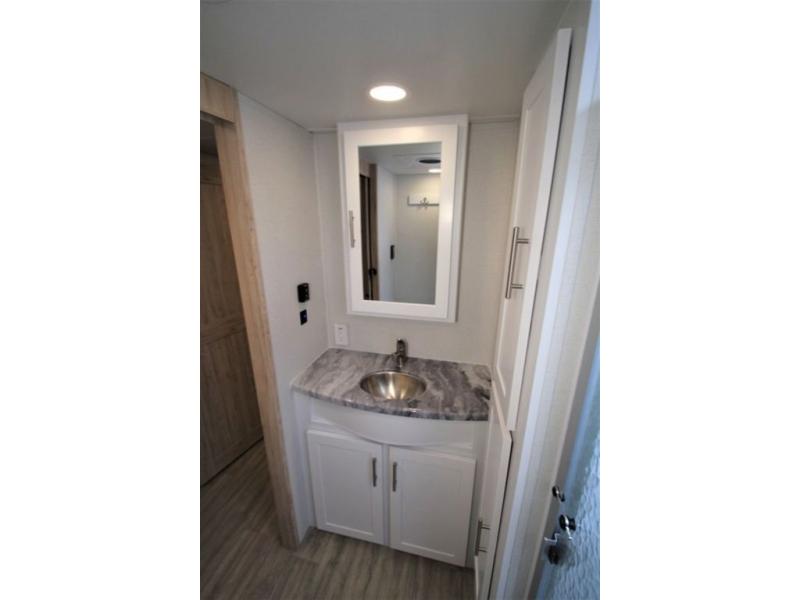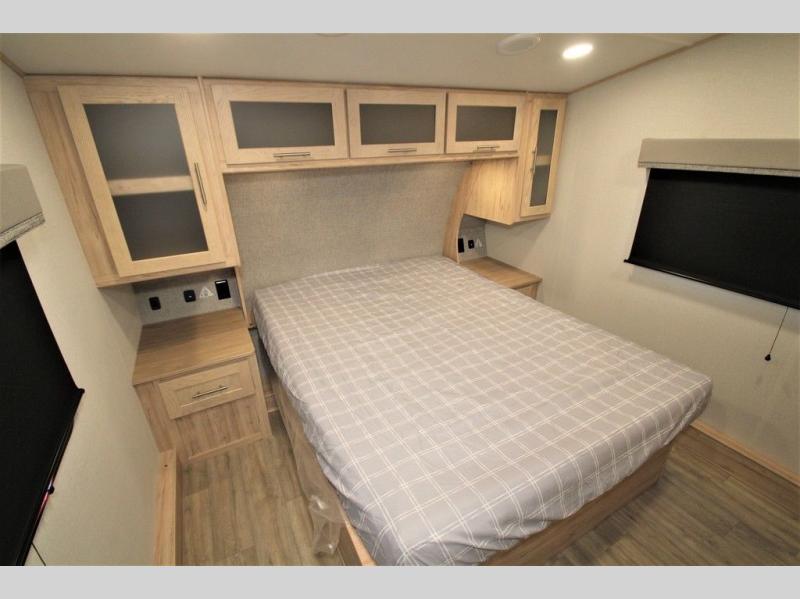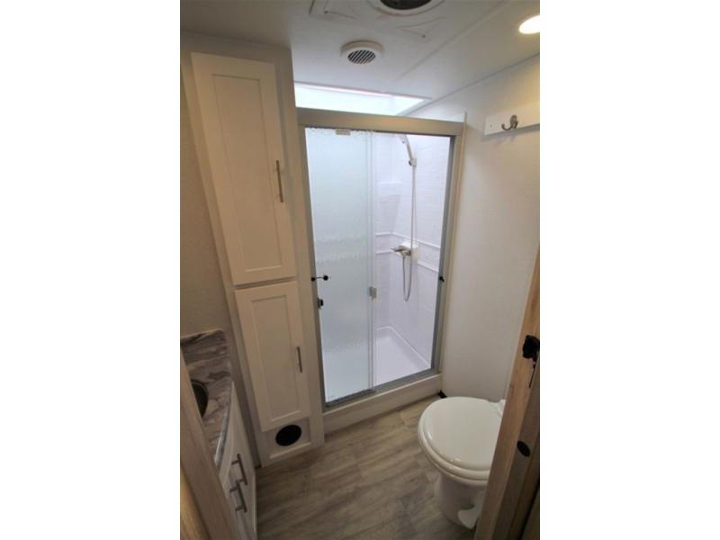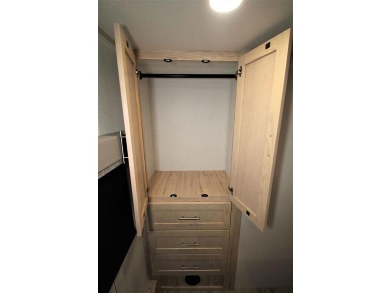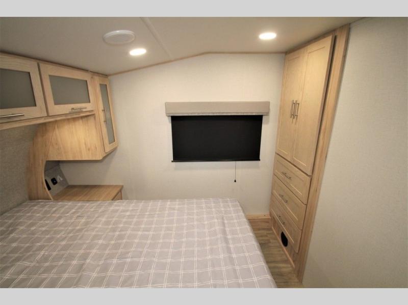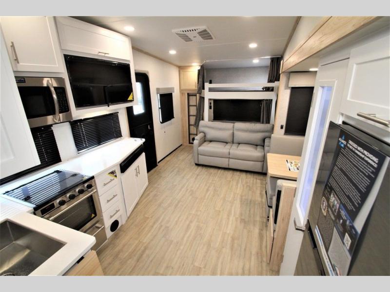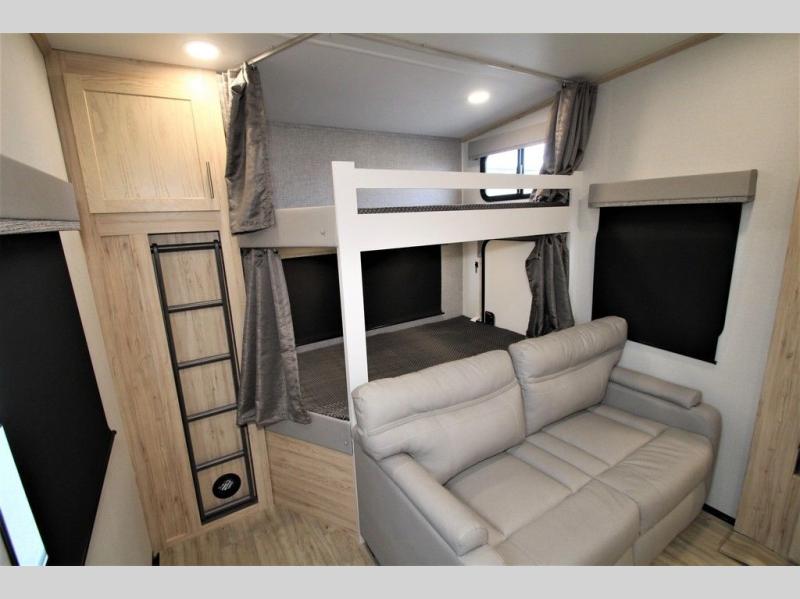Your family will enjoy traveling in this bunk model including two 42" x 74" bunks featuring storage beneath that can be accessed from outside using the bike storage door, or by lifting up the lower hinged bunk from inside. The combined living room and kitchen area is spacious thanks to the large slide which houses the floating dinette table, the 10 cu. ft. 12V refrigerator and pantry. There is more seating adjacent to this slide. Here you will find a sofa, and all seating can easily view the swing mount 40" Class HDTV. In front up the steps, you will find a spacious side aisle bath including a 30" x 36" shower, toilet, vanity with sink and medicine cabinet, plus linen storage as well. Continue on to the front private bedroom with a walk-around queen bed plus nightstands and a closet off the foot of the bed to keep your clothing neat and tidy. You will also find overhead storage space above the bed for additional items.