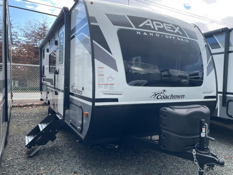 You will find comfort, convenience, and a sturdy construction with each of these Coachmen RV Apex Nano travel trailers! They are held together with an aluma-cage construction, vacuum-bonded Azdel fiberglass walls, an I-beam chassis, and a roof membrane with Dicor Crossflex, plus the powder coated frame is corrosion resistant. The Dexter E-Z lube axles and nitrogen filled radial tires will help you arrive safely. The mandatory Nano package comes with many features to make camp life better like magnetic baggage door catches, outside speakers, a digital TV antenna with cable hook-ups and WiFi capability, and a hot/cold outside shower to keep the dirt outside where it belongs. Come find the perfect model that fits your needs today!