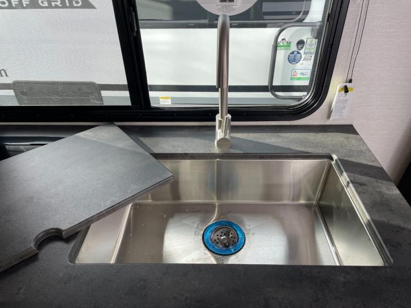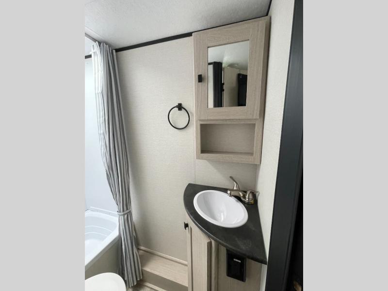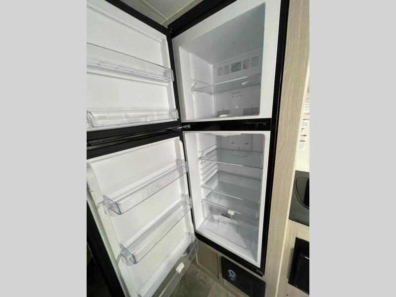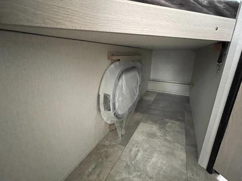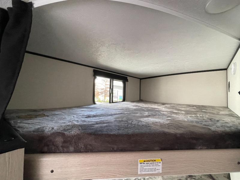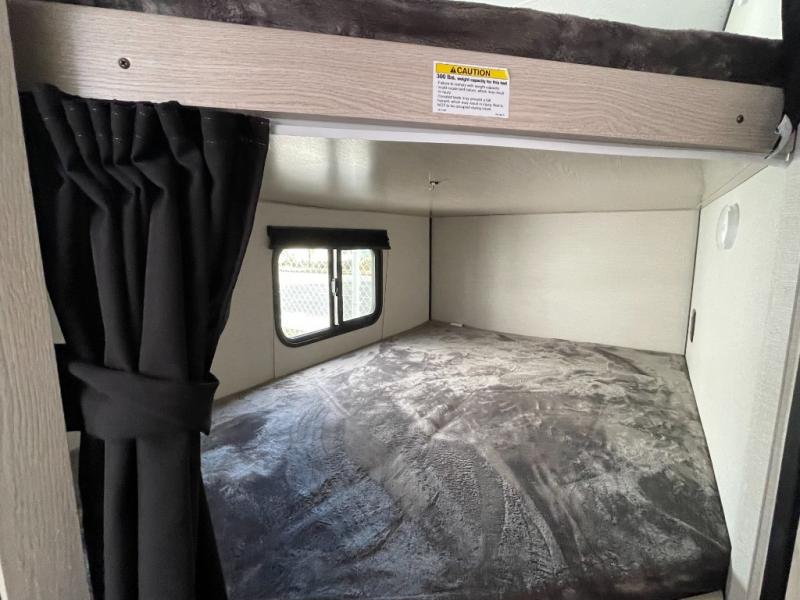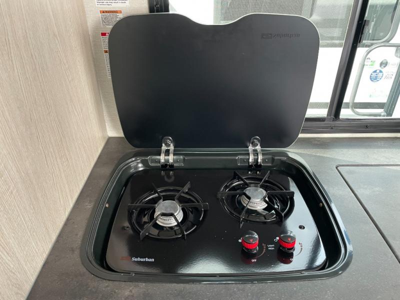 This travel trailer offers versatility with a front Murphy bed! Depending on what time of day you enter the unit will determine whether you see the bed or the sofa. There is a rear corner double bed bunk above a lower flip up double bed and a booth dinette that can transform into an extra sleeping space when you're not using it to enjoy a meal or play a card game. Everyone can stay clean with tub/shower in the rear corner bathroom and keep their bellies full with the two burner cooktop and 6 cu. ft. gas/electric refrigerator. You can even cook outdoors with the exterior camp kitchen while staying protected by the power awning with LED lighting!