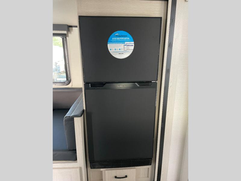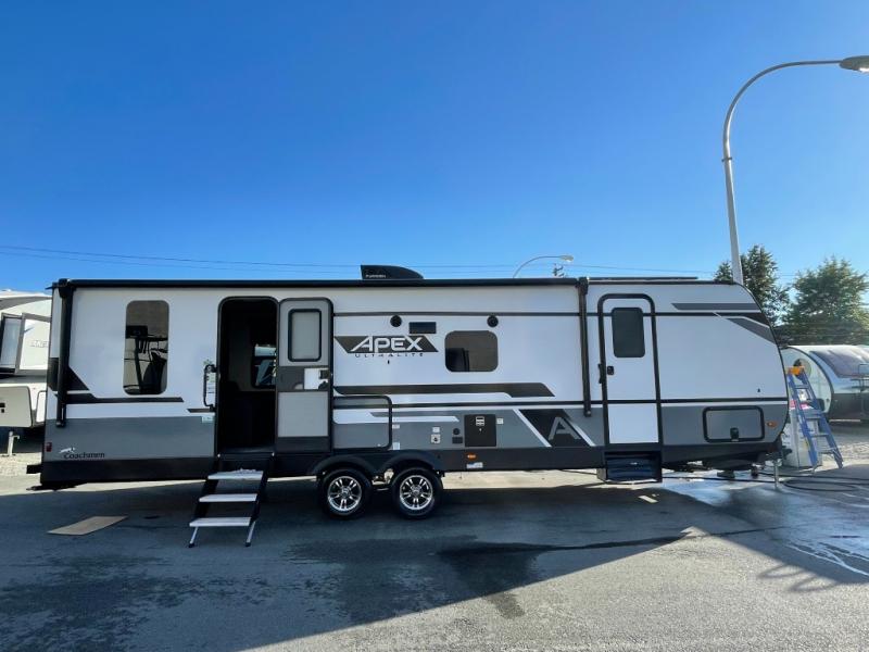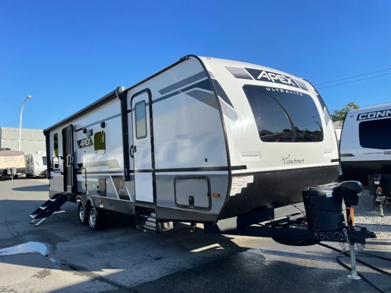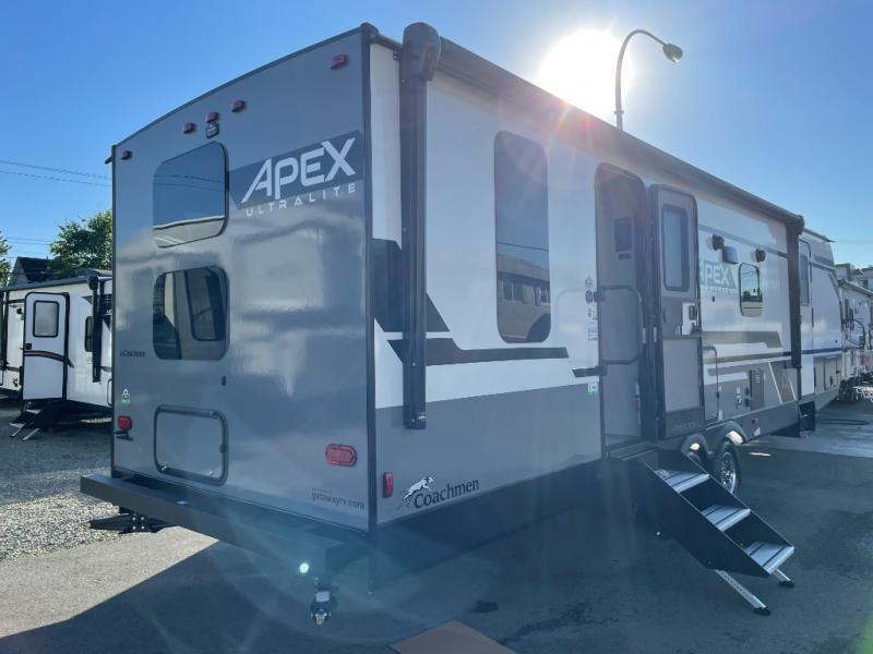 Lightweight living and camping is found with the Apex Ultra-Lite travel trailers by Coachmen. These eco-friendly units are made to last thanks to the Azdel composite sidewalls, the laminated aluminum floor, and the vacuum-bonded laminated crowned roof. Lippert axles and nitrogen filled radial tires make towing easier than ever, plus there is a friction hinge entrance door, a 100-watt solar panel with a 10 Amp control charger, and slam latch baggage door catches for easy unloading. Some of the interior comforts you'll fall in love with are the one-piece seamless edge countertops, the hard valances with night shades throughout, the matte black hardware, and the residential comforter. The Apex Ultra-Lite trailers also include USB ports, a digital TV antenna with cable hook-ups and Wi-Fi capability, and an AM/FM stereo with Bluetooth to ensure you'll never be bored on rainy camp days!