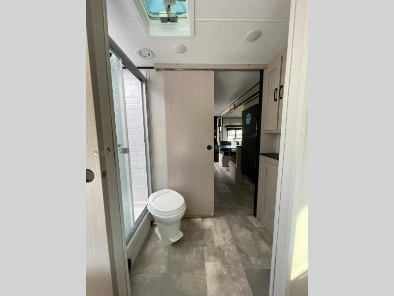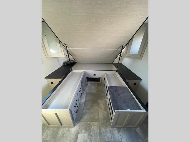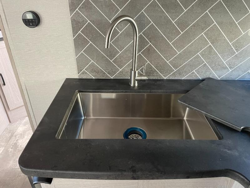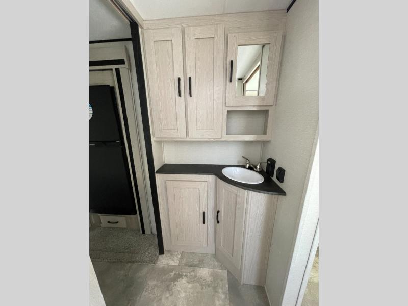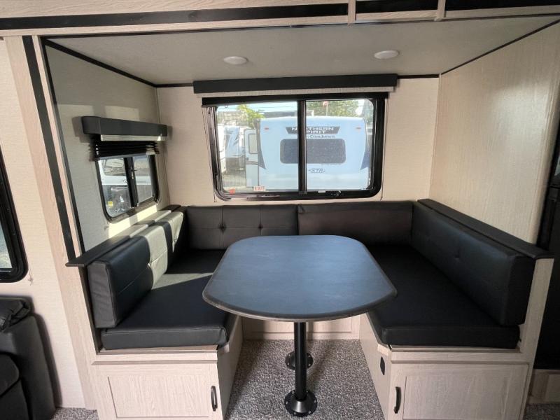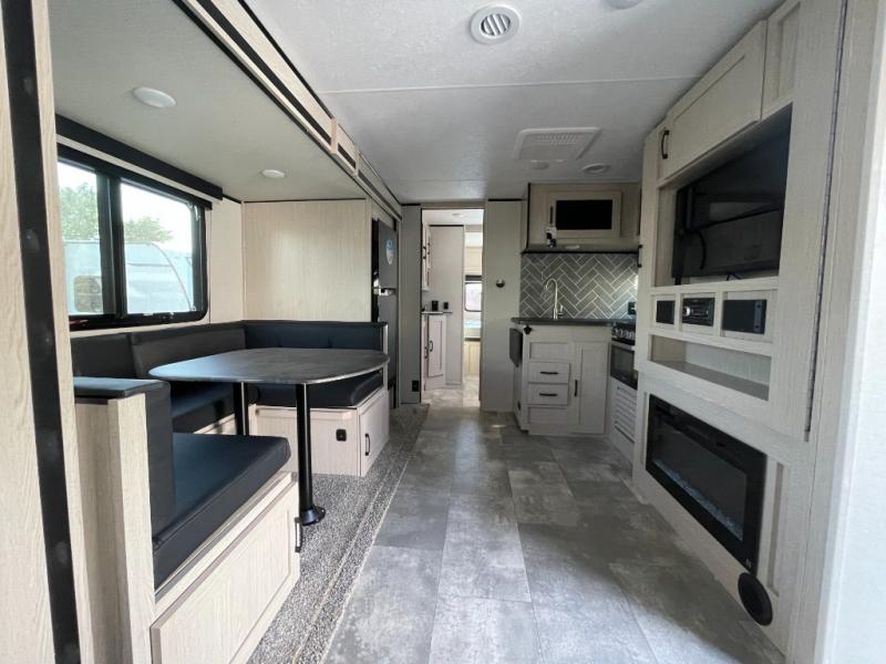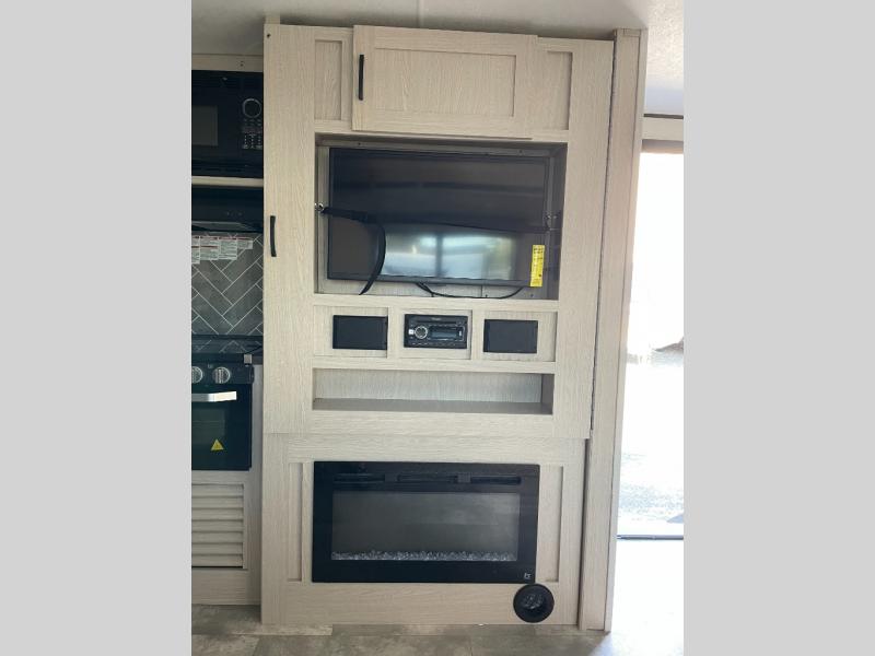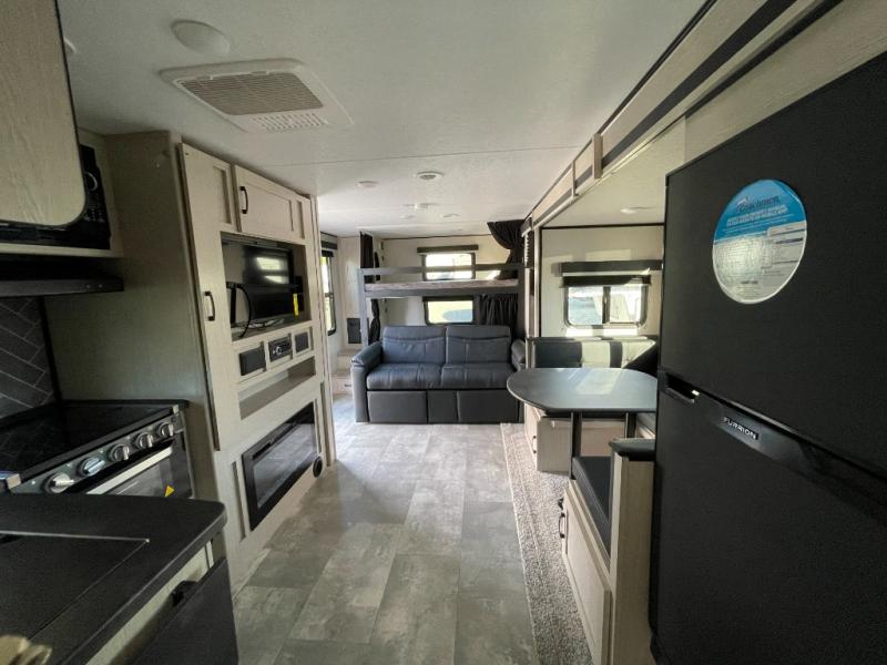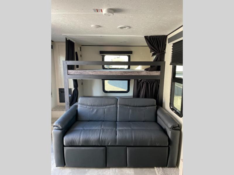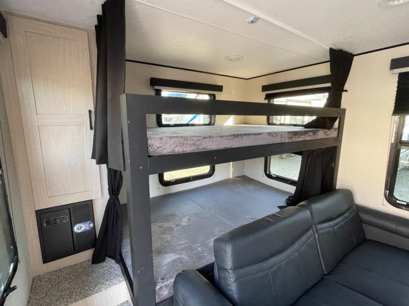 Camping with family or a larger group of friends is easier than ever in this dual entry trailer that can sleep nine people comfortably. The little ones will love the double-size bunks with storage steps, and you'll have the queen bed with super storage all to yourselves. There is also a U-shaped dinette slide and a sofa for even more sleeping space. If the weather is nice, you'll find yourselves outdoors under the 20' power awning and enjoying a snack from the exterior camp kitchen. This model also includes a 32" LED TV, and you'll find the pantry/storage behind the entertainment center for added convenience.
