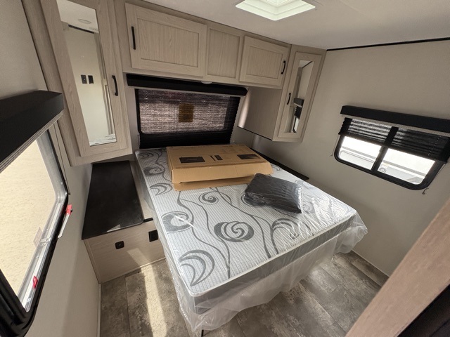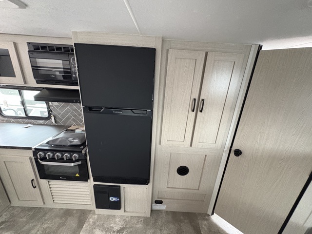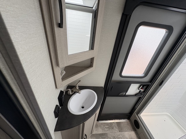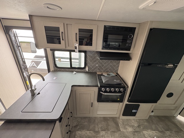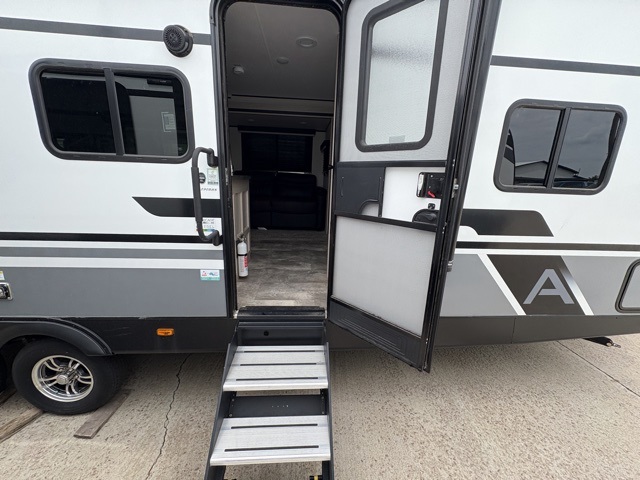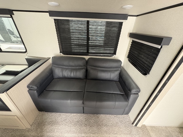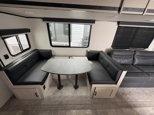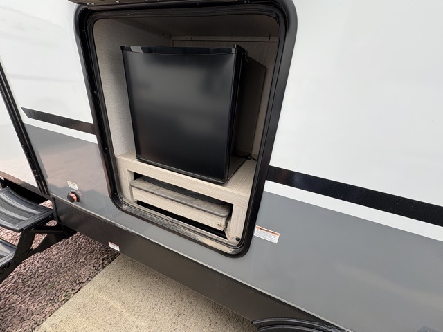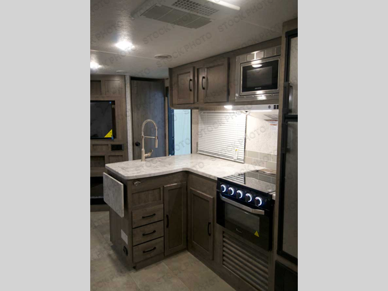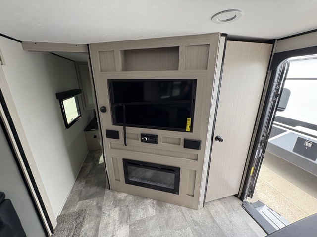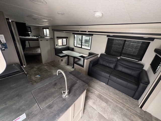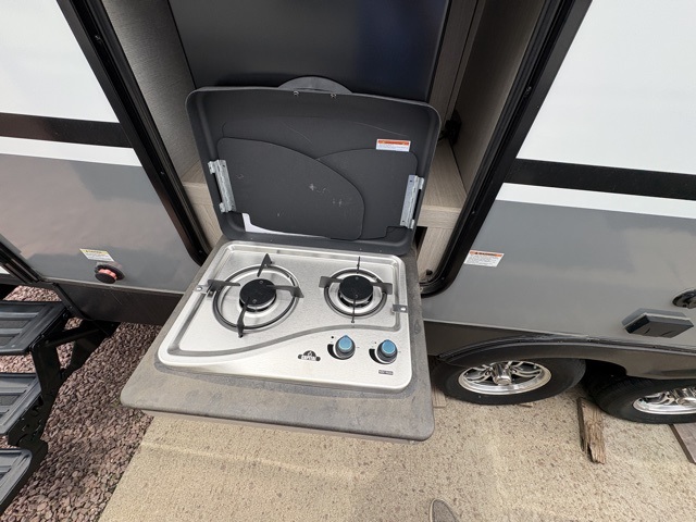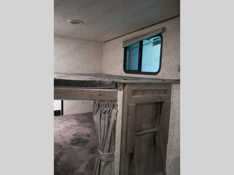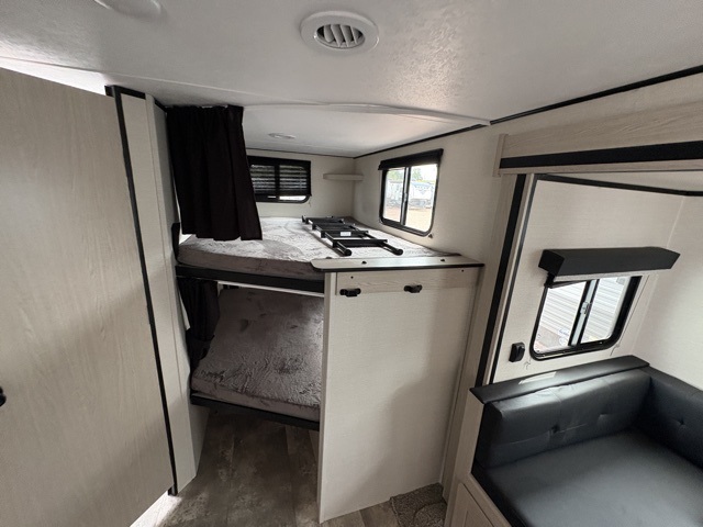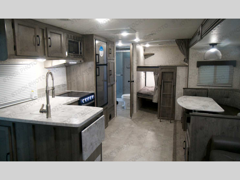 Pack your bags and head to your local state park for fun in this dual entry travel trailer. The kids will love the double-size bunks that include a ladder, and the full bath with its own exterior entry door is close by for nighttime use. The main living area will be a favorite hangout spot with its large slide out, U-shaped dinette, sofa, and 40" LED TV! The chef can cook at-home meals on the three burner cooktop, plus there is an exterior camp kitchen for quick meals outdoors. And check out the front private bedroom with a queen bed, dual wardrobes, and a linen closet for clean towels!
