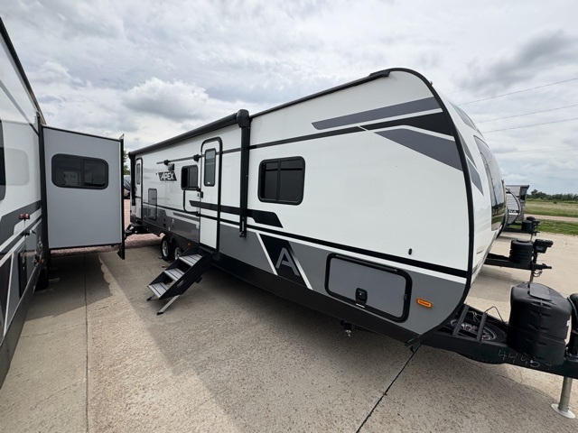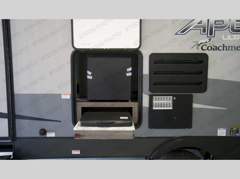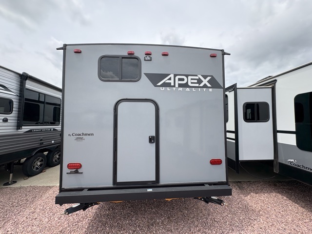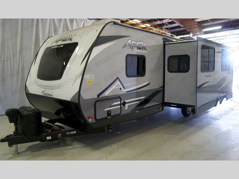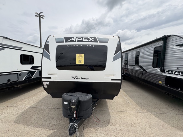 Lightweight living and camping is found with the Apex Ultra-Lite travel trailers by Coachmen. These eco-friendly units are made to last thanks to the Azdel composite sidewalls, the laminated aluminum floor, and the vacuum-bonded laminated crowned roof. Lippert axles and nitrogen filled radial tires make towing easier than ever, plus there is a friction hinge entrance door, a 100-watt solar panel with a 10 Amp control charger, and slam latch baggage door catches for easy unloading. Some of the interior comforts you'll fall in love with are the one-piece seamless edge countertops, the hard valances with night shades throughout, the matte black hardware, and the residential comforter. The Apex Ultra-Lite trailers also include USB ports, a digital TV antenna with cable hook-ups and Wi-Fi capability, and an AM/FM stereo with Bluetooth to ensure you'll never go bored on rainy camp days!