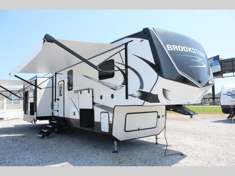 The Brookstone fifth wheels by Coachmen are coming to you with wide-body comfort, home-like amenities, and unique designs for a truly luxurious RV. The 4 Season Protection Package includes double batten insulated roof with radiant barrier insulation, Weather Shield+, a 40,000 BTU high capacity furnace, and more that will help you extend your camping season or go full-time. The frameless automotive-style windows feature 80% privacy tint safety glass, and the vacuum bonded and aluminum framed sidewalls with rot proof Azdel will provide durability. Head inside to find solid hardwood drawers, granite/marble style solid surface countertops in the kitchen, a residential bed with a pillow top mattress and full storage underneath, and the list of comforts goes on! The Brookstone also includes 6-point electric auto-leveling, marine-grade exterior speakers with an LED light, four Solid Step entry steps, and many more exterior conveniences!