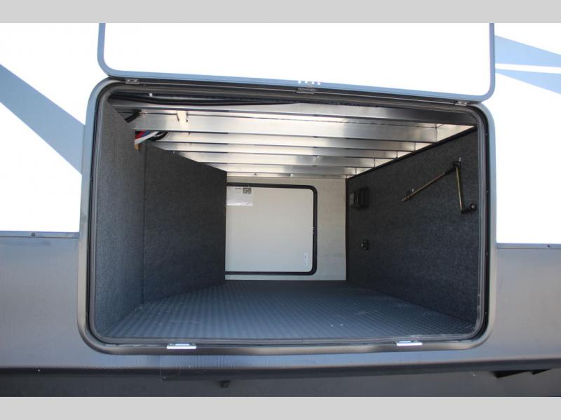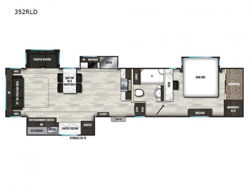 This fifth wheel is designed to make sure you enjoy every square foot! The private queen bedroom has plenty of storage, with a dresser and wardrobe, including prep for an optional washer and dryer. Plus there's a desk area with a chair so you can have a private space to set up your laptop and get some work done. In the living room, you have a variety of luxurious furniture, including a tri-fold sofa, theater seats, and an entertainment center. Step into the kitchen where you can sit at the bar top table with four bar stools. The kitchen is fully equipped with a residential cooktop and oven, microwave, and refrigerator. There's tons of storage, which also includes extra touches like a pantry with an adjacent coffee station so you can have a dedicated space to make hot drinks. Don't miss the outside amenities either, including a power awning and an exterior refrigerator.