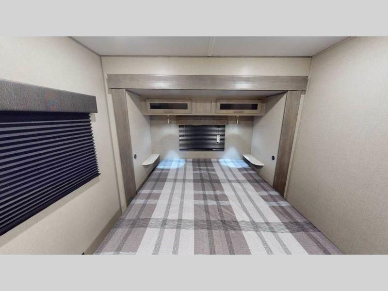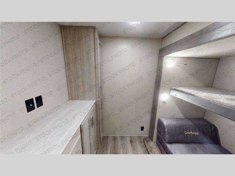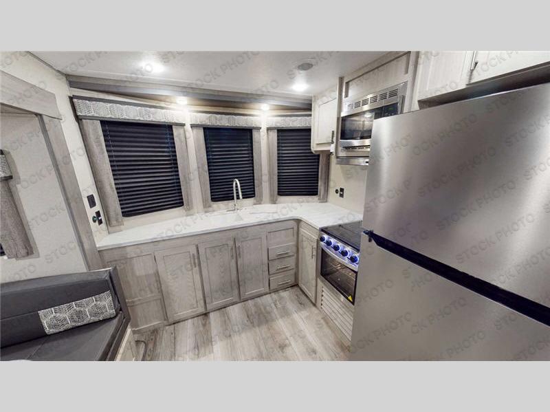Pack up your clothes and groceries and head out for a long weekend at your own place, this destination trailer! You can enter through the main patio door or near the rear bedroom and full bathroom. You will find storage throughout in the wardrobes, linen cabinet, pantry and more! The kids will surely head to the middle bunkhouse featuring a COA cube futon and upper bunk, as well as an additional living area. Someone will probably relax on the tri-fold sofa or eat a snack at the booth dinette and bar top with stools while watching the fireplace and the 39” TV with dual zone entertainment sound bar. The ceiling fans will keep you cooler in the summer months along with the air conditioner. And the cook will love the front kitchen layout and all the appliances to keep everyone fed.