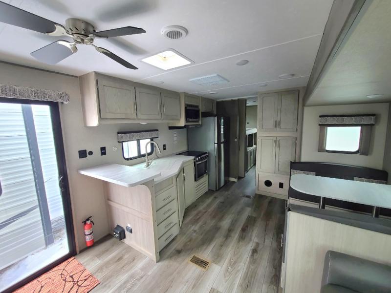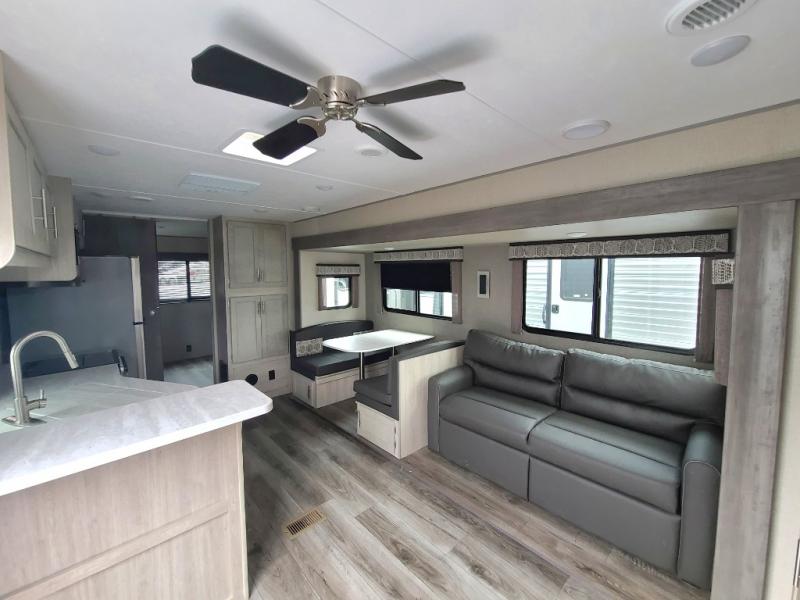 Your kids are ready to get away, are you? From having their own rear private bunkhouse with a COA cube futon and flip-up bunk above, and second bunk on the opposite side, they may only come out to play when the sun is shining! When you want to do a little entertaining, the main living area will be the perfect spot to do so with its breakfast bar and bar stools, booth dinette, and tri-fold sofa. You might even want to choose the free standing dinette option if you prefer that type of seating. The private front bedroom with its own exterior entry door features a queen bed as a nice retreat, and with a separate entry door you can easily slip out for late-night star gazing, a quiet evening out under the optional 21' patio awning, or an early morning walk. There is an additional option, a full size camp kitchen... outside, if that sounds like something that would be needed or even wanted!