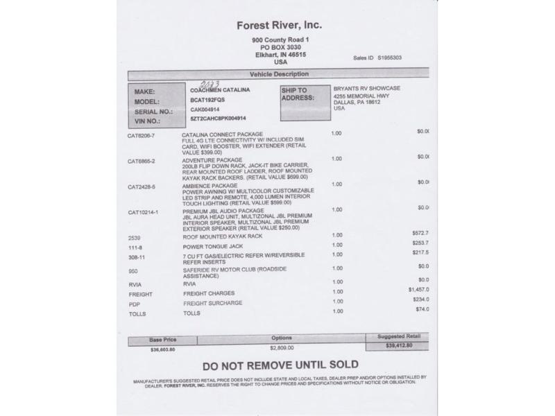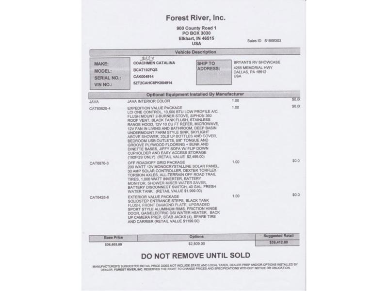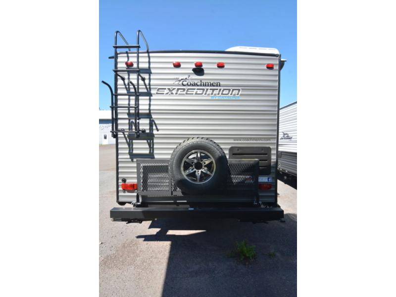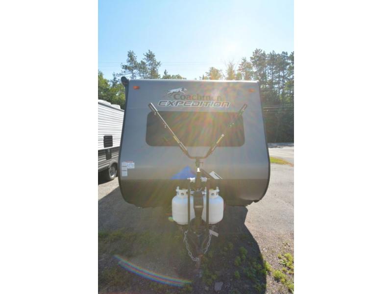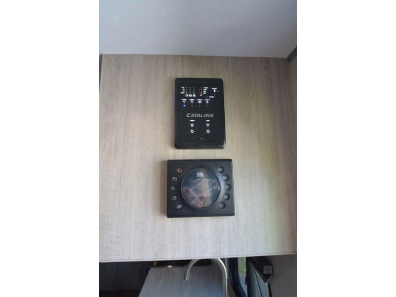 With any Catalina Expedition travel trailer by Coachmen, you will have a lightweight RV that was built with a cambered structural steel l-beam frame, a seamless Alpha roof membrane, fiberglass insulation throughout. There are oversized off-road fender flares, all terrain tires, and a premium exterior graphics package. On the outside, an electric awning includes a multicolor LED strip with a remote offering a covered outdoor living area that can be utilized during the day or night, plus a multizonal JBL premium exterior speaker to listen to tunes. The interior provides Congoleum woodplank linoleum flooring, seamless Thermofoil countertops throughout, hard valance window treatments, and so much more! It's time to start your expedition!