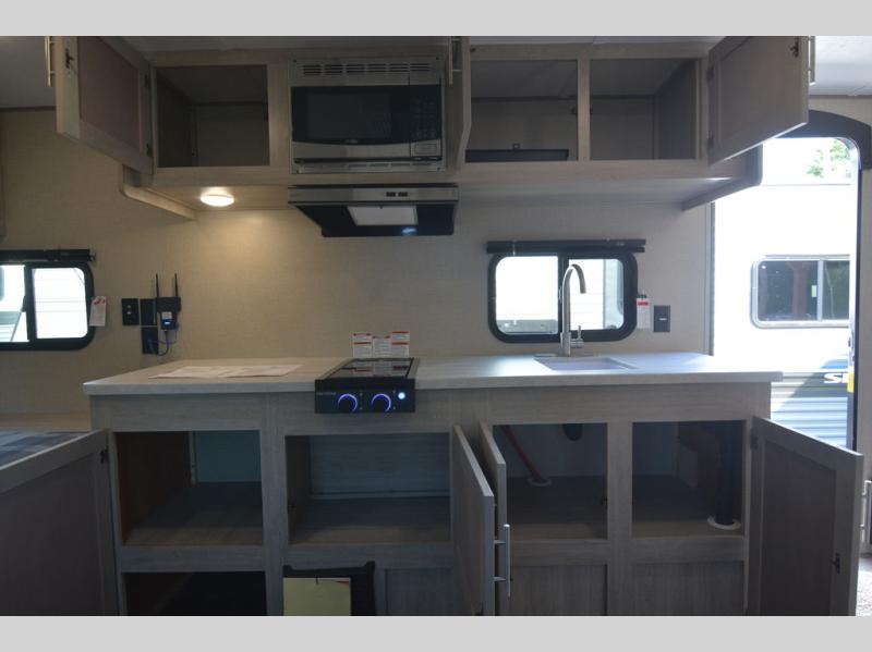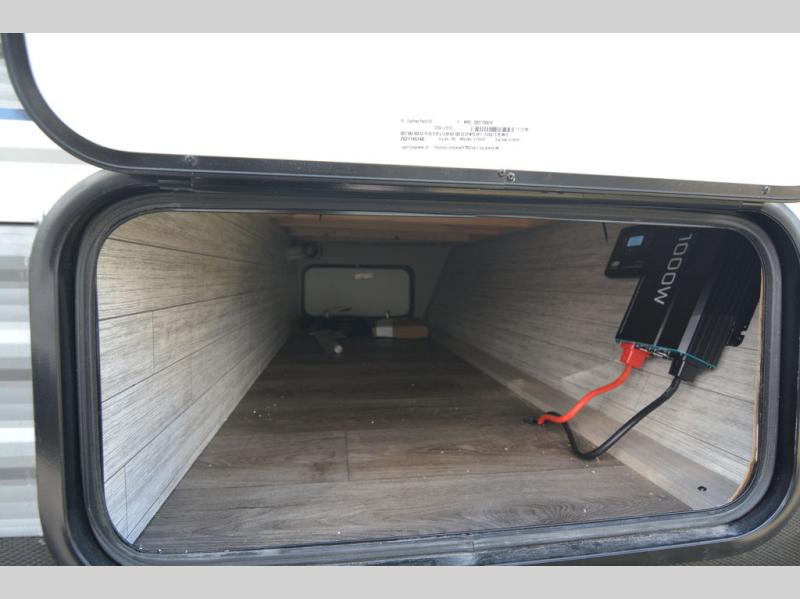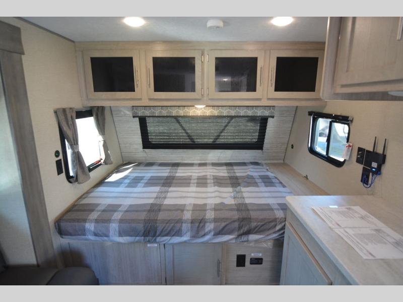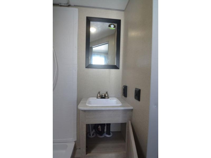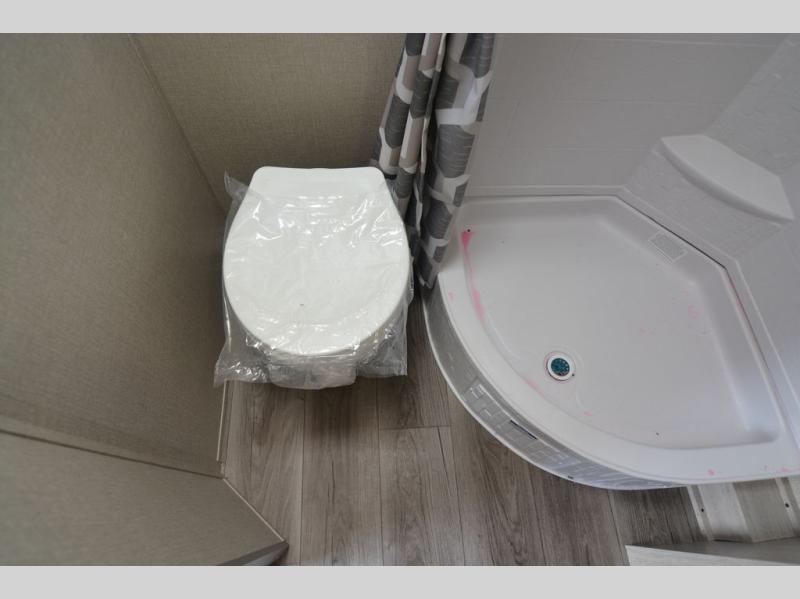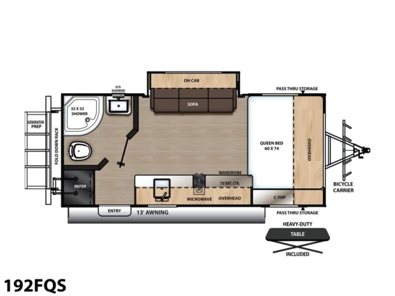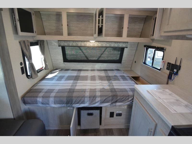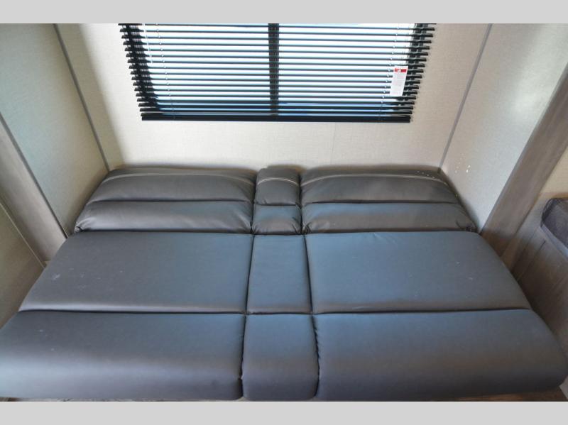 Get ready for adventure either at a local RV park or off-grid as you enjoy the outdoors. You will be able to return to your own accommodations in this trailer with a spacious interior thanks to the single slide that offers more elbow room and floor space to move about, and plenty of space to stretch your legs, and dine. This area is also great for an overnight guest or two small children to sleep on. Spend your days outside swimming at the lake or hiking trails to return to a rear corner bath with a 32" x 32" radius shower that will allow you to get cleaned up before bed. You will find an RV queen bed with a countertop at the foot of the bed which is a perfect spot to drop your phones for the night or stash your reading material, alarm clock and/or purse/wallet. This model also includes a heavy-duty table to use indoors or outdoors!