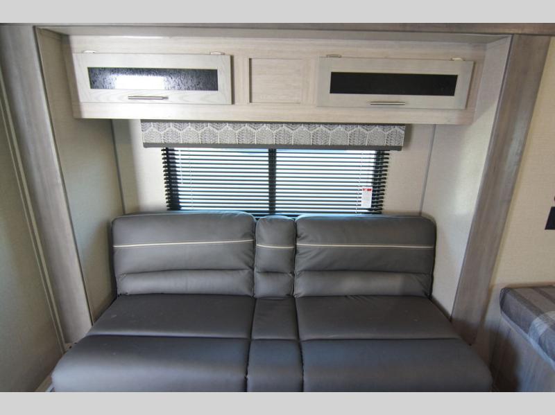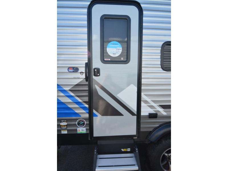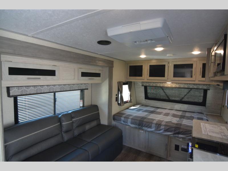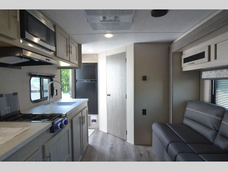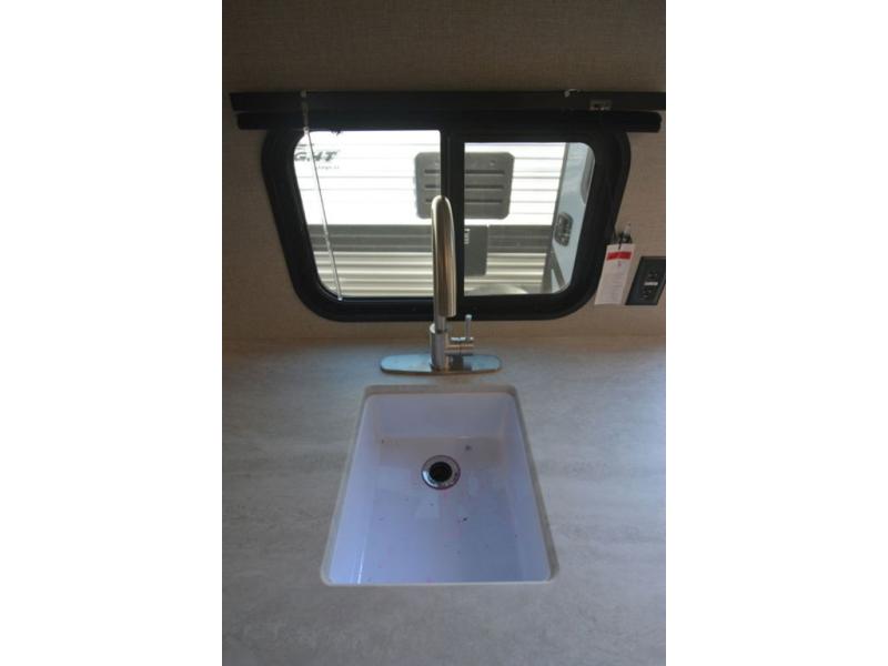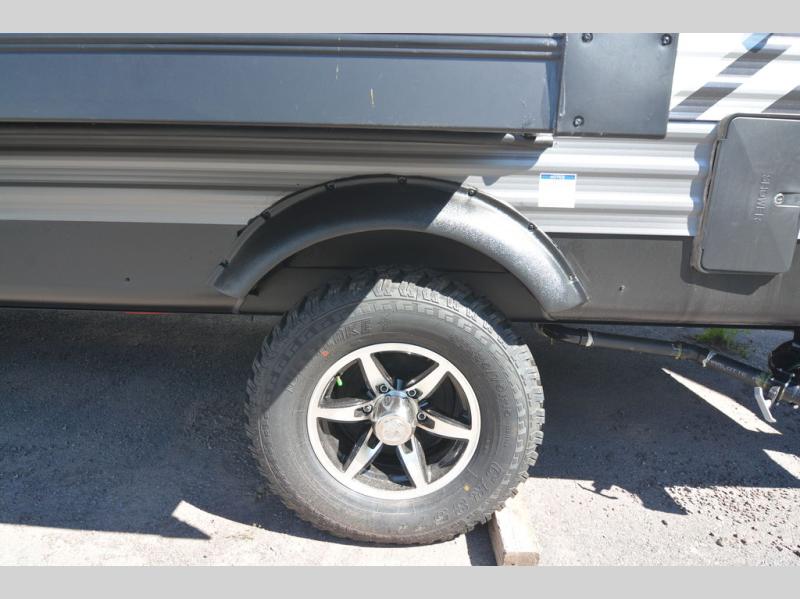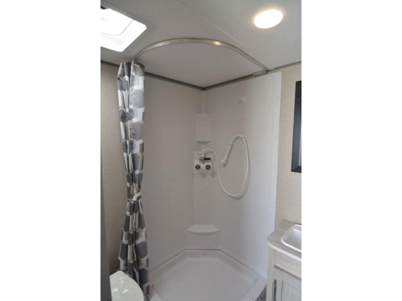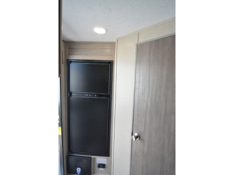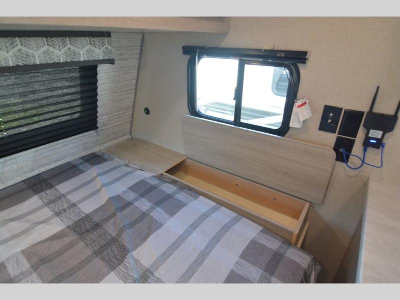 Get ready for adventure either at a local RV park or off-grid as you enjoy the outdoors. You will be able to return to your own accommodations in this trailer with a spacious interior thanks to the single slide that offers more elbow room and floor space to move about, and plenty of space to stretch your legs, and dine. This area is also great for an overnight guest or two small children to sleep on. Spend your days outside swimming at the lake or hiking trails to return to a rear corner bath with a 32" x 32" radius shower that will allow you to get cleaned up before bed. You will find an RV queen bed with a countertop at the foot of the bed which is a perfect spot to drop your phones for the night or stash your reading material, alarm clock and/or purse/wallet. This model also includes a heavy-duty table to use indoors or outdoors!