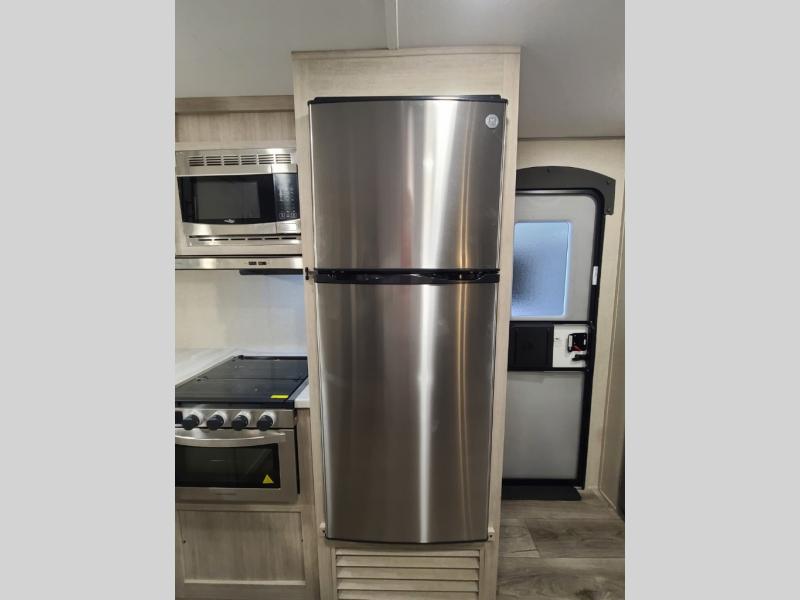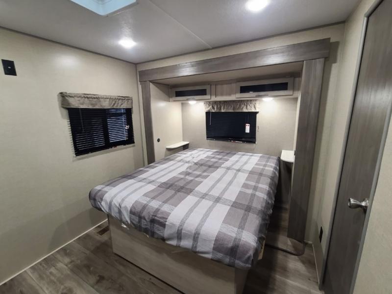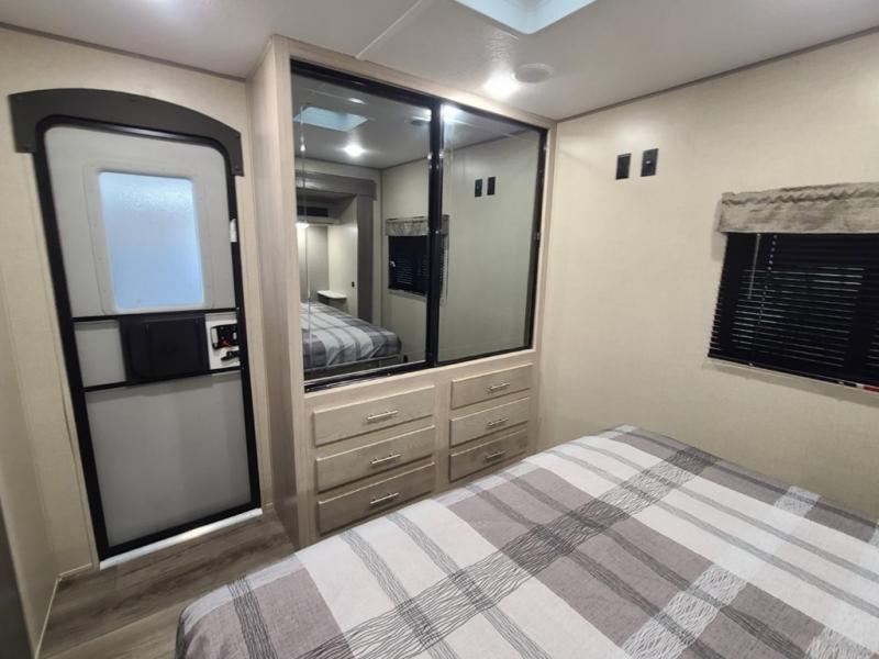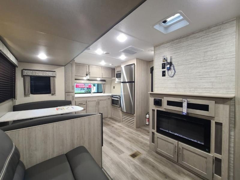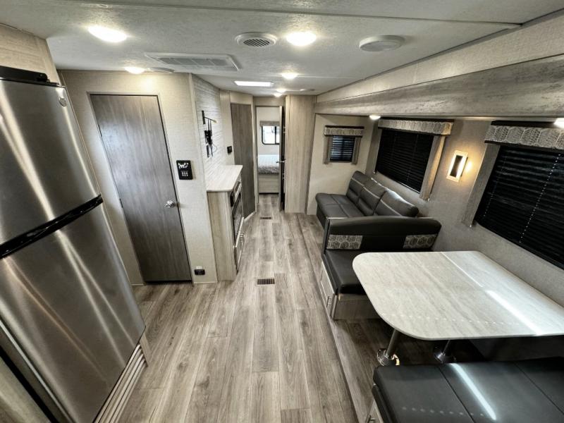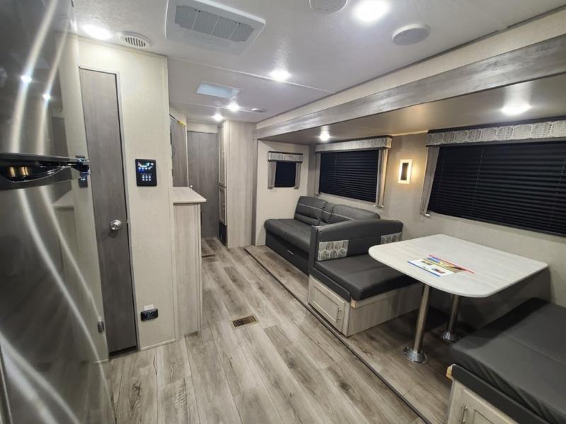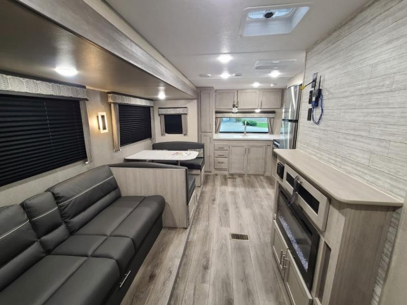 Step into comfort with this front kitchen travel trailer! You will love the amount of counter space you have to prep and cook meals. There is also an outdoor camper kitchen with a griddle and mini refrigerator for breakfast outdoors. There is plenty of storage space for all your belongings, including two kitchen pantries, overhead cabinets, a closet and a wardrobe, plus a pass-through storage. Your crew can get comfortable on the 70" sofa and booth dinette within the large slide out, and there is an entertainment center if you plan to bring your own TV. And don't overlook the rear master bedroom with a queen bed slide out, a wardrobe, plus its own exterior entry door!