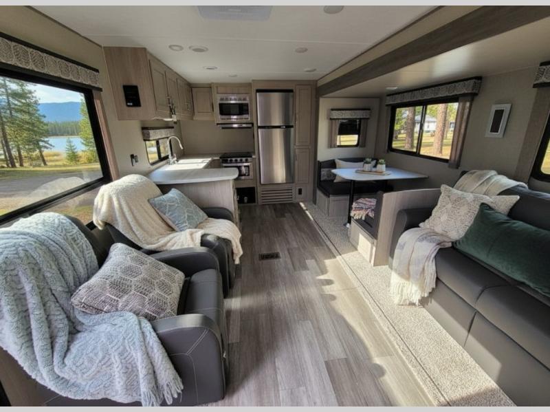 Whether you camp to relax indoors or play outdoors, this trailer offers interior comforts for a couple or a family of four! From the spacious rear kitchen thanks to the large slide out that includes a booth dinette and sofa. Yet you might like to choose the free standing dinette option in place of the booth dinette. The U-shaped counter offers plenty of space to dry dishes and prep meals. There is a 10 cu. ft. refrigerator and pantry for food storage, and everyone can enjoy the entertainment center with a fireplace option below while cooking, cleaning, dining and relaxing. And the recliner lounges will probably be popular seats. At night head to the front bedroom to sleep on the walk-around king bed after stopping off at the full bathroom to get cleaned up.