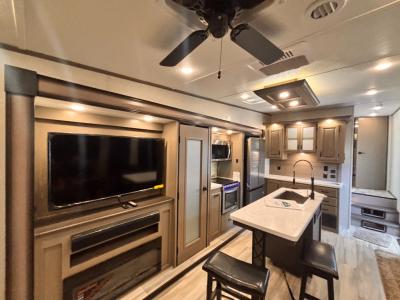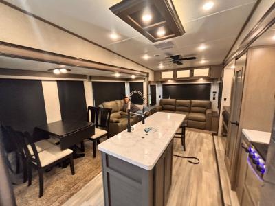 Are you wanting to trade out your busy work weeks for relaxing vacations? This fifth wheel can give you just that! Once you arrive at your destination, set up the 16' power awning with LED lights and enjoy some fresh air before you unpack your bags. The chef can start lunch on the three burner residential cooktop, and there is an island with two barstools if the little ones want to color while they wait on their food. This model also includes a residential pantry, a second pantry, plus a hutch with upper and lower cabinets. Everyone can take turns cleaning up in the full bath that includes a spacious 30" x 50" shower with a seat, a large privacy dome skylight, plus LED motion sensor lighting for nighttime use. When it's time to call it a night, you'll enjoy the queen bed slide out in the front bedroom, while your guests take the rear tri-fold hide-a-bed sofa!