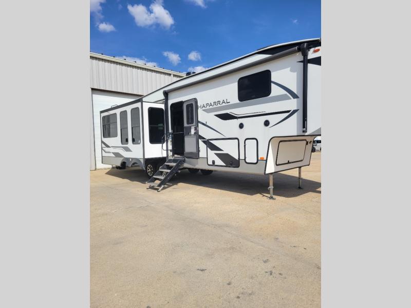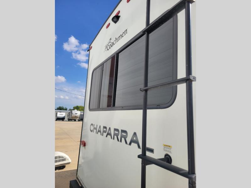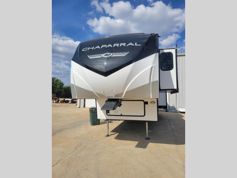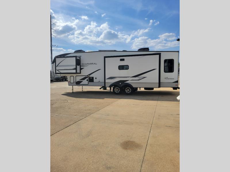 Each Chaparral mid-profile fifth wheel by Coachmen is designed with residential features, loads of storage space, and roomy bedroom suites to make you feel right at home. The durable construction means you can enjoy your RV for years to come. There's dual-sided Azdel composite sidewall panels, Weather Shield+ technology, and Tri-Tex powder coated frame technology that will allow you to camp year around. Each model includes a Winegard Air 360 HDTV/radio dome antenna and an AM/FM/CD/DVD player with Bluetooth to keep your entertained, plus roller night shades and a modern electric fireplace to make your space cozy. There is also a large transom window in the kitchen, a modern high-rise faucet, LED motion sensor lights in the bathroom, plus a full-size shower with glass doors and a seat. Now that's what I call luxury! Choose a Chaparral fifth wheel today!
