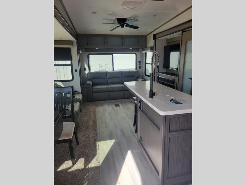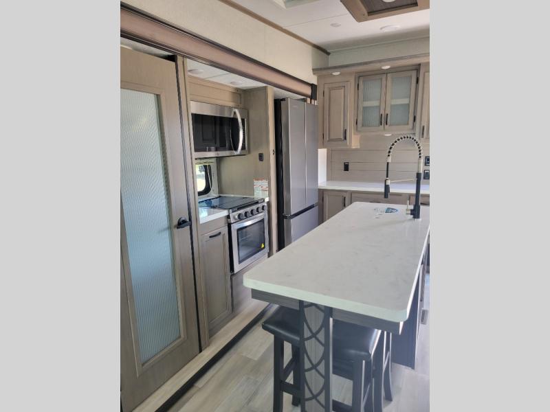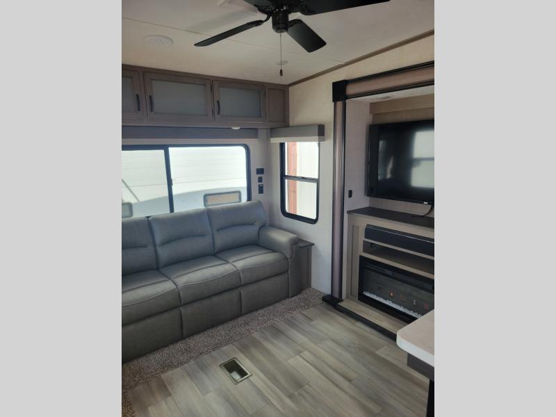 Are you wanting to trade out your busy work weeks for relaxing vacations? This fifth wheel can give you just that! Once you arrive at your destination, set up the 16' power awning with LED lights and enjoy some fresh air before you unpack your bags. The chef can start lunch on the three burner residential cooktop, and there is an island with two barstools if the little ones want to color while they wait on their food. This model also includes a residential pantry, a second pantry, plus a hutch with upper and lower cabinets. Everyone can take turns cleaning up in the full bath that includes a spacious 30" x 50" shower with a seat, a large privacy dome skylight, plus LED motion sensor lighting for nighttime use. When it's time to call it a night, you'll enjoy the queen bed slide out in the front bedroom, while your guests take the rear tri-fold hide-a-bed sofa!