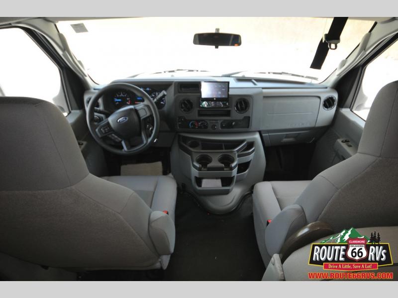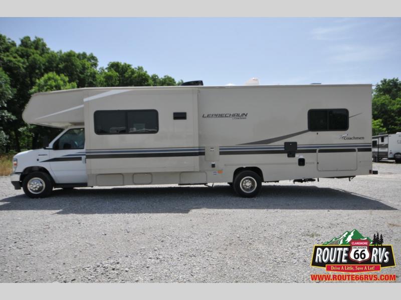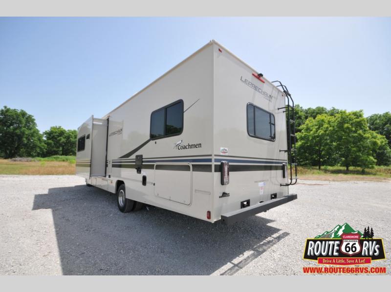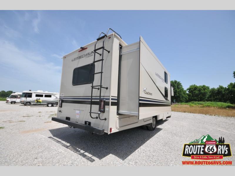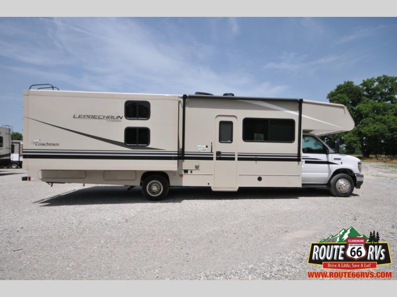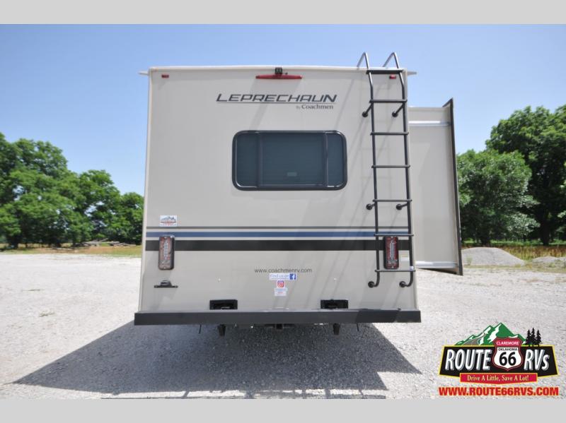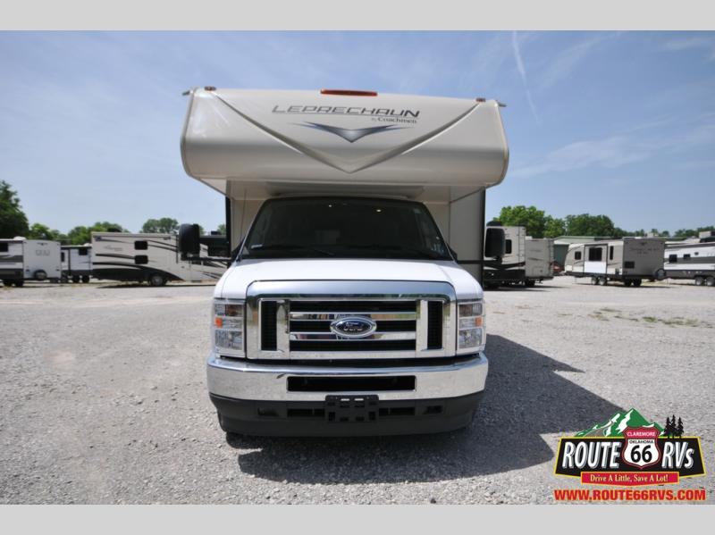 With each Leprechaun Class C gas motorhome by Coachmen you will enjoy "better" interior appointments, like the premium hardwood cabinet doors and drawer fronts, the one-piece thermofoil countertops, and the premium vinyl flooring. You will sleep soundly each night on the upgraded mattress, and staying clean will be easy with the premium showerhead and faucet in the bath. These models include reclining captain's seats, cruise control, and a rear backup camera so you can easily get in and out of the campground. The Leprechaun is constructed with Azdel composite sidewalls, CrossFlex PVC, polyester reinforced roof material, and vacu-bond laminated walls, roof, and floor for a durable motorhome made to last.