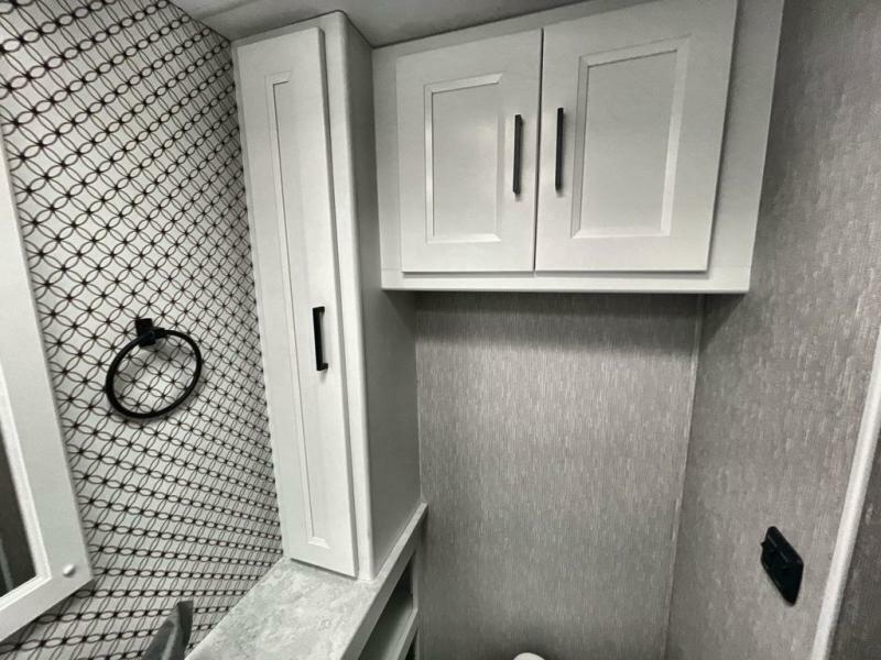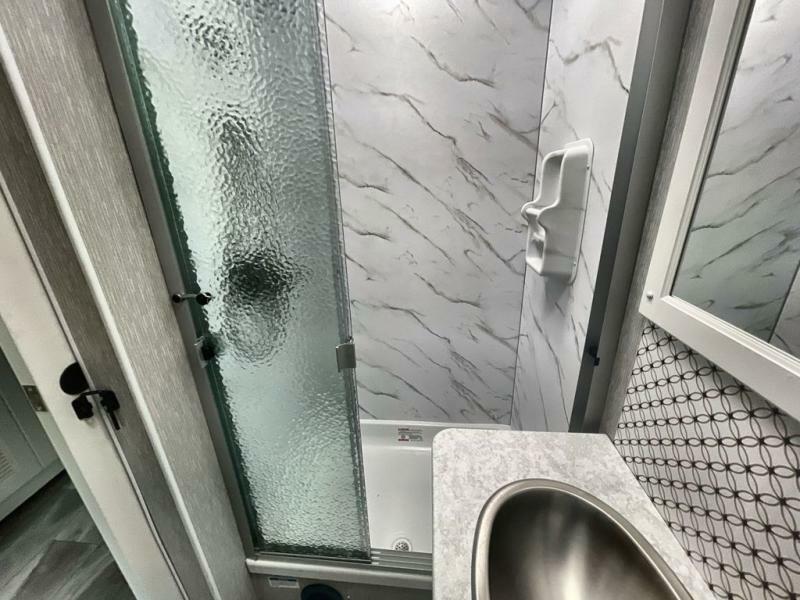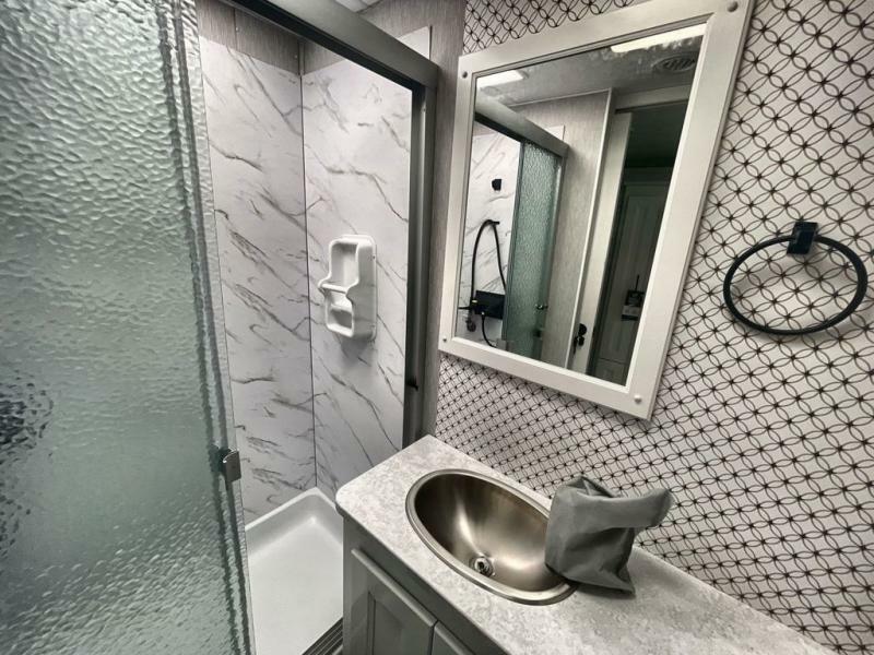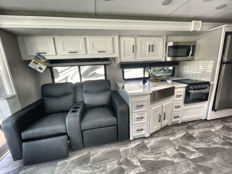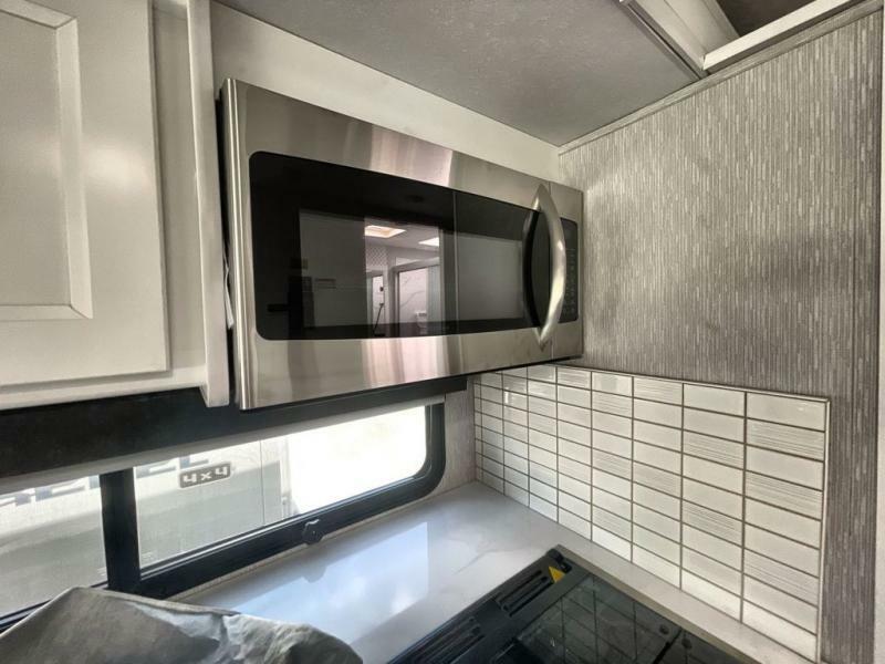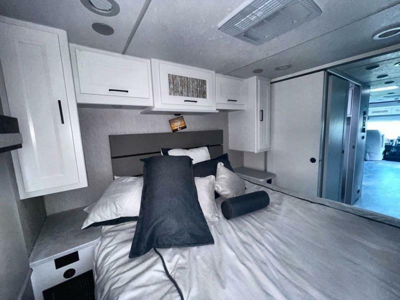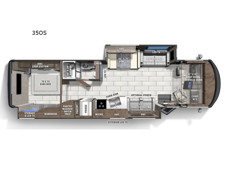 Your family will love this spacious coach for trips across the country or your local state park. The swivel captain's seats provide more seating, along with the sofa bed, theater seating and booth dinette. There is a 50" LCD TV for rainy day movies and an exterior LED TV under the 20' power awning if the weather is cooperating. The full bath includes a glass shower door, plenty of counter space, and a shower skylight for added light, and the rear bedroom will be your oasis away from it all. Here, you'll find a king bed, a wardrobe for your clothes, plus a 32" LCD TV.
