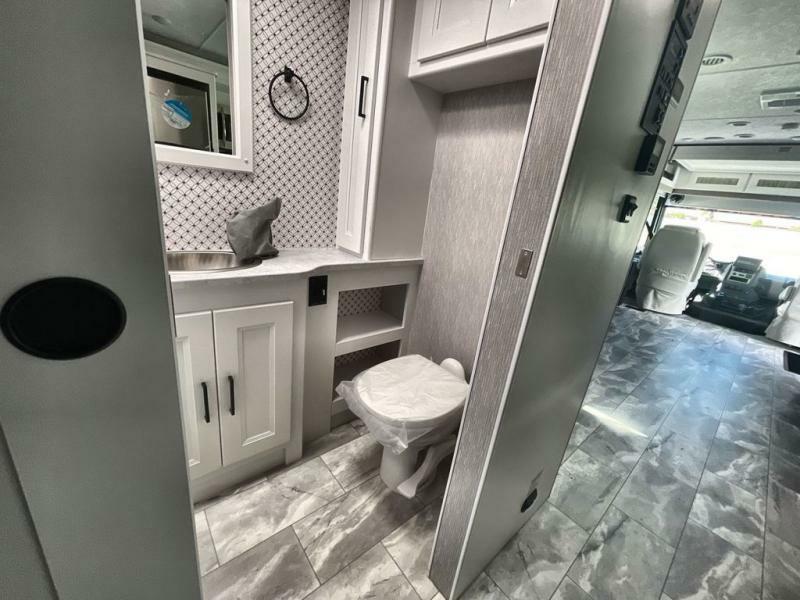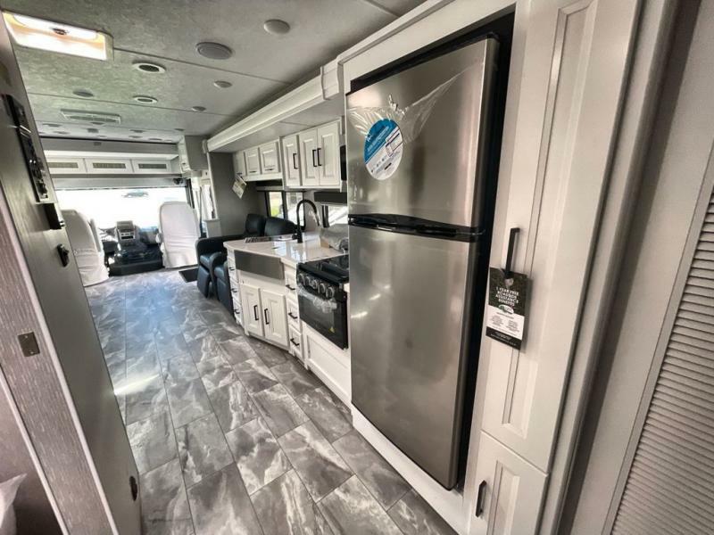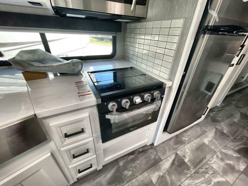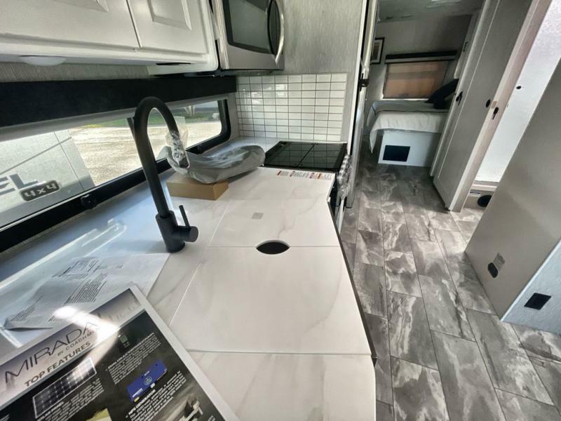 Each Mirada Class A gas motorhome by Coachmen is constructed with a crowned, laminated fiberglass roof with Azdel Superlite composite for added durability, along with high gloss "Oyster" gelcoat sidewalls. There is a 7.3L V8 engine on a Ford F53 chassis for power you can feel, and a 10" touch screen radio with AM/FM radio with Bluetooth capability. The 5.5 kW gas generator, dual coach batteries, and 100W solar panel with a controller will meet all your power needs, and the automatic leveling jacks make setting up camp a breeze. Head inside to find premium linoleum throughout, hardwood cabinet doors, kitchen tile backsplash, and solar privacy shades throughout to name a few comforts. The open road is yours for the taking in a Mirada Class A gas motorhome!
