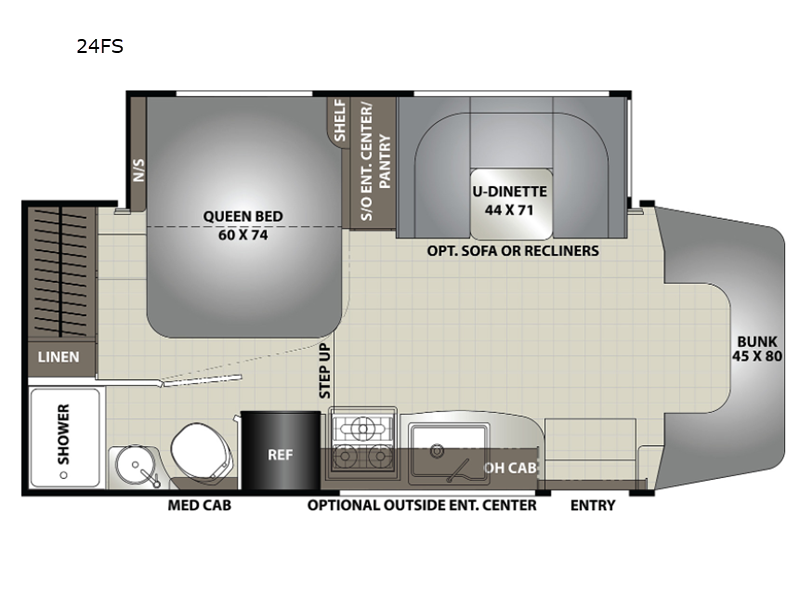 With extra space from the full-wall slide, you'll love spending time in this Prism Select Class C diesel motorhome! You can bring along the whole gang because the RV queen bed, the U-shaped dinette, and 45" x 80" bunk above the cab will provide plenty of sleeping space, and the ample storage will be very helpful for everyone's belongings. You can also stock up on some treats and goodies with the pantry slide out and the refrigerator, and the full bathroom is a great convenience to have whenever you need to get cleaned up. Plus, there is an optional outside entertainment center that can be added and the dinette can be switched out for an optional sofa or recliners!