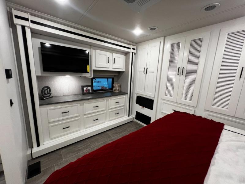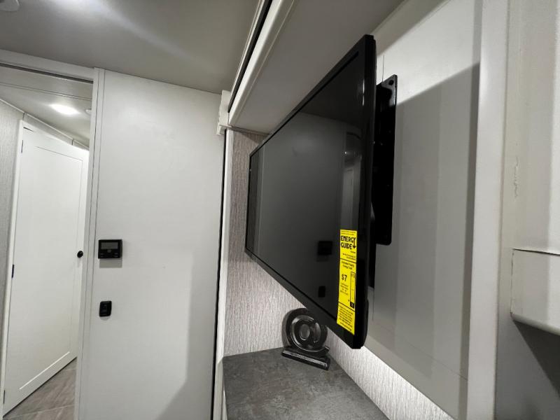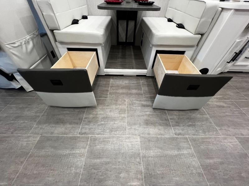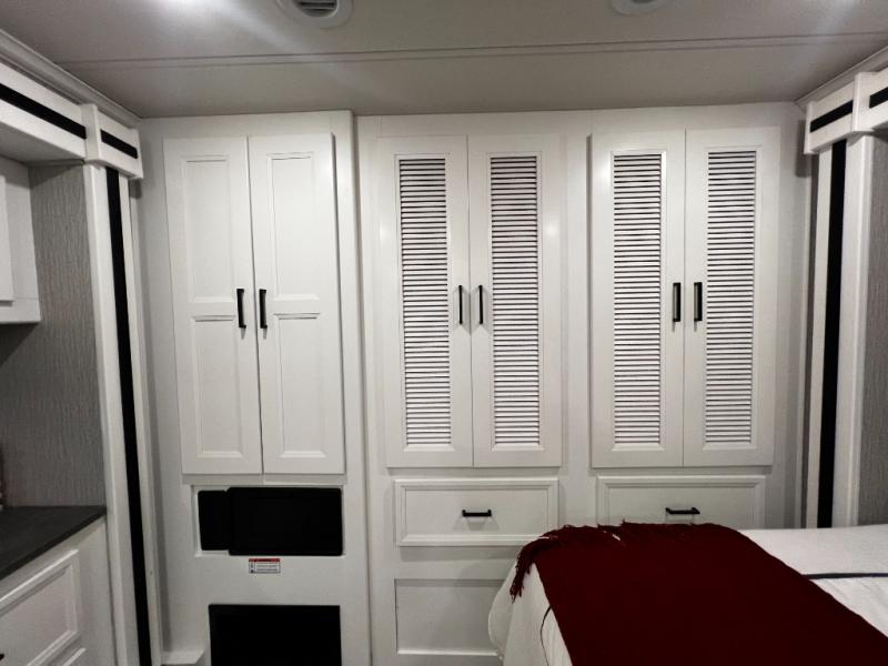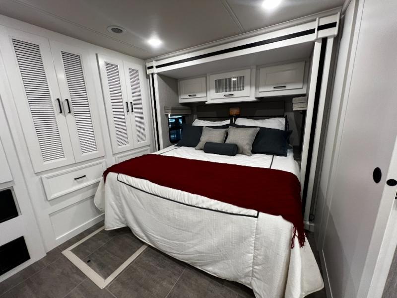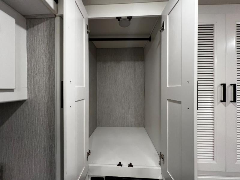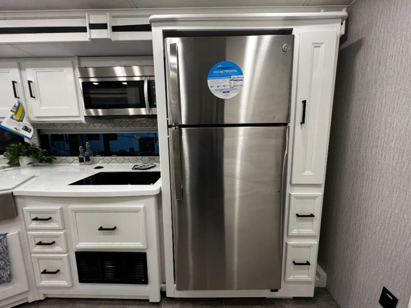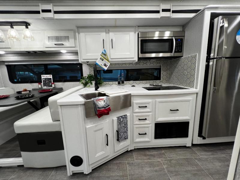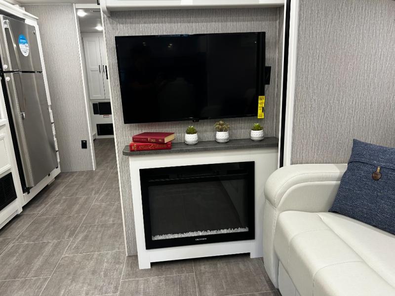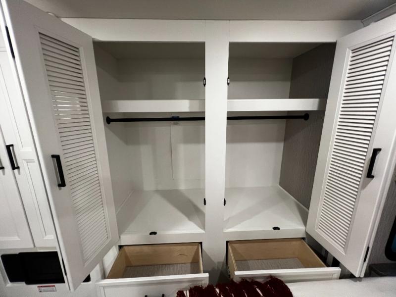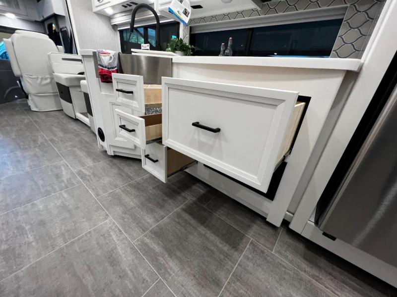 You will love how much space you have in this coach thanks to the four slide outs, plus you can sleep up to six with the added drop-down overhead bunk. Your crew can get comfortable on the 78" sofa by the fireplace and 40" TV, or play a game at the booth dinette. You can choose the optional theater seating in place of the sofa if you don't need the additional sleeping space. This models features a two burner induction cooktop, a convection microwave, plus a pantry for dry goods and snacks. Within the full bath you'll find a deluxe fiberglass shower with a skylight and dual bath sinks that are sure to come in handy when you both need to brush your teeth. The rear private bedroom is designed to make you feel at home with its two wardrobes, king bed slide out, and a 32" LED TV. One of the wardrobes even includes washer and dryer prep to make going full-time easy as 1-2-3!