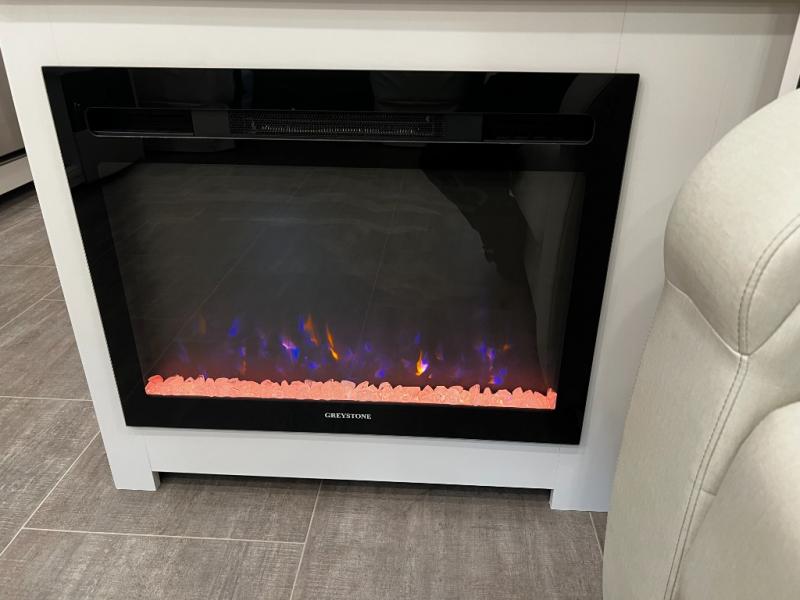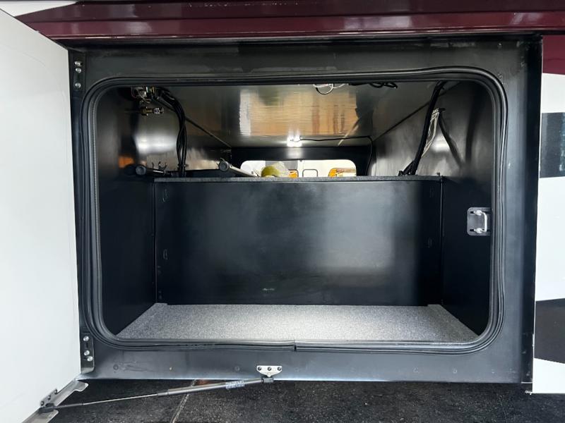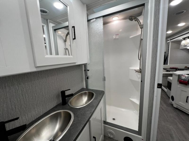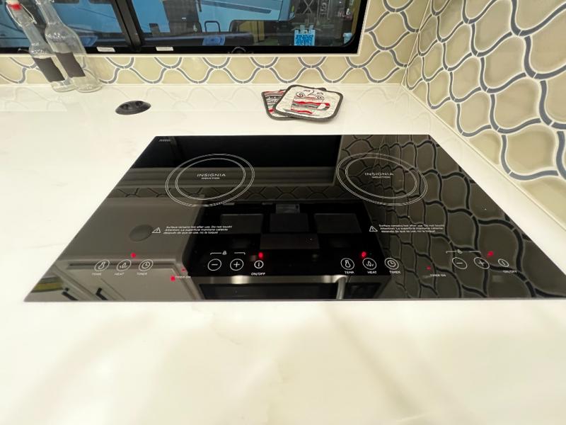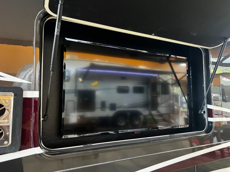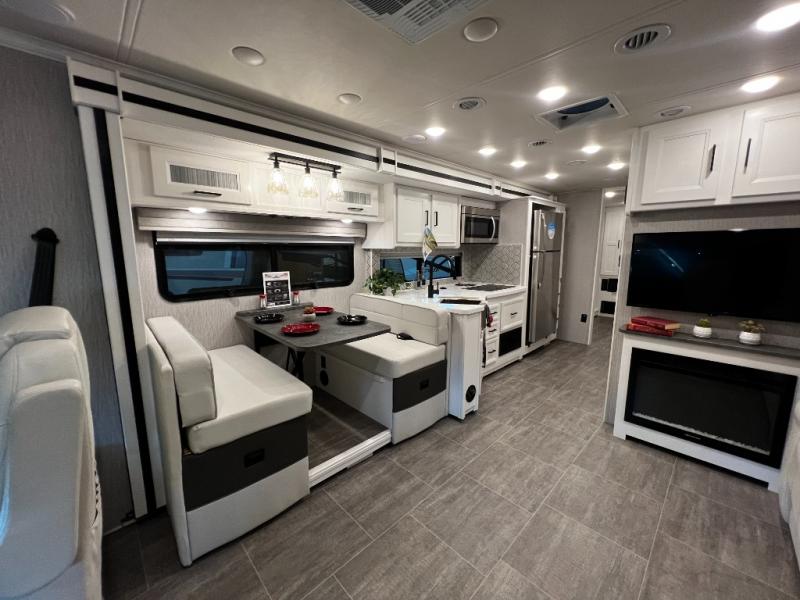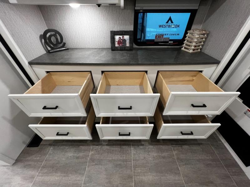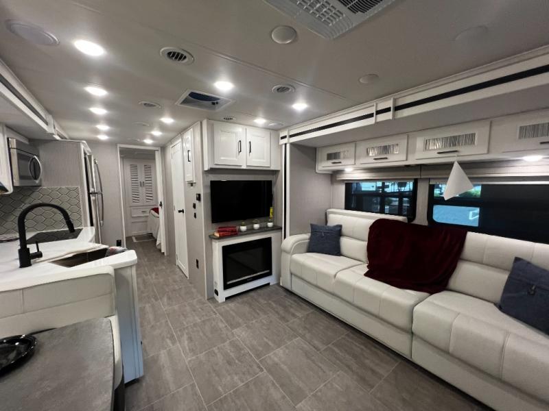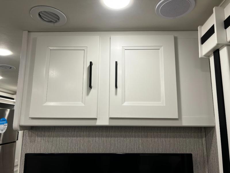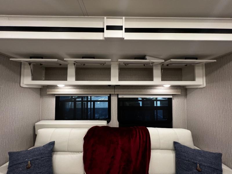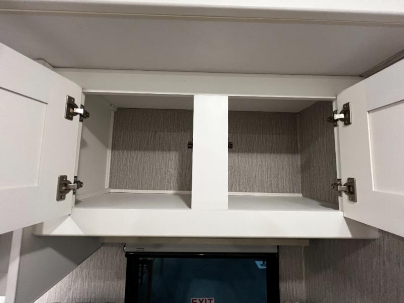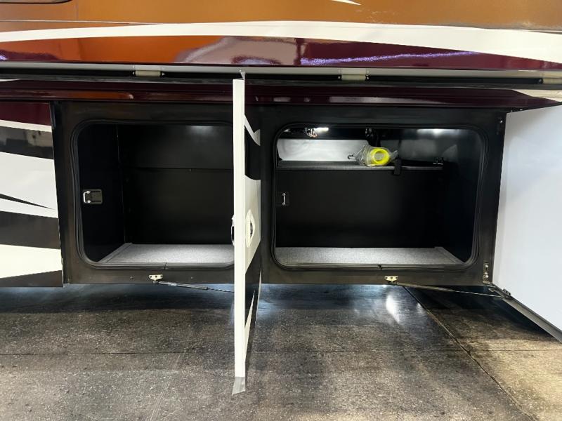 You will love how much space you have in this coach thanks to the four slide outs, plus you can sleep up to six with the added drop-down overhead bunk. Your crew can get comfortable on the 78" sofa by the fireplace and 40" TV, or play a game at the booth dinette. You can choose the optional theater seating in place of the sofa if you don't need the additional sleeping space. This models features a two burner induction cooktop, a convection microwave, plus a pantry for dry goods and snacks. Within the full bath you'll find a deluxe fiberglass shower with a skylight and dual bath sinks that are sure to come in handy when you both need to brush your teeth. The rear private bedroom is designed to make you feel at home with its two wardrobes, king bed slide out, and a 32" LED TV. One of the wardrobes even includes washer and dryer prep to make going full-time easy as 1-2-3!