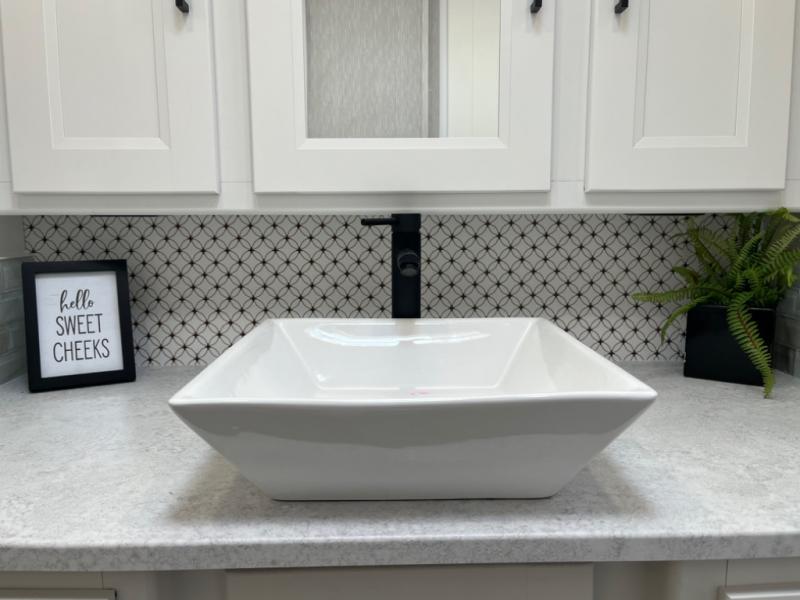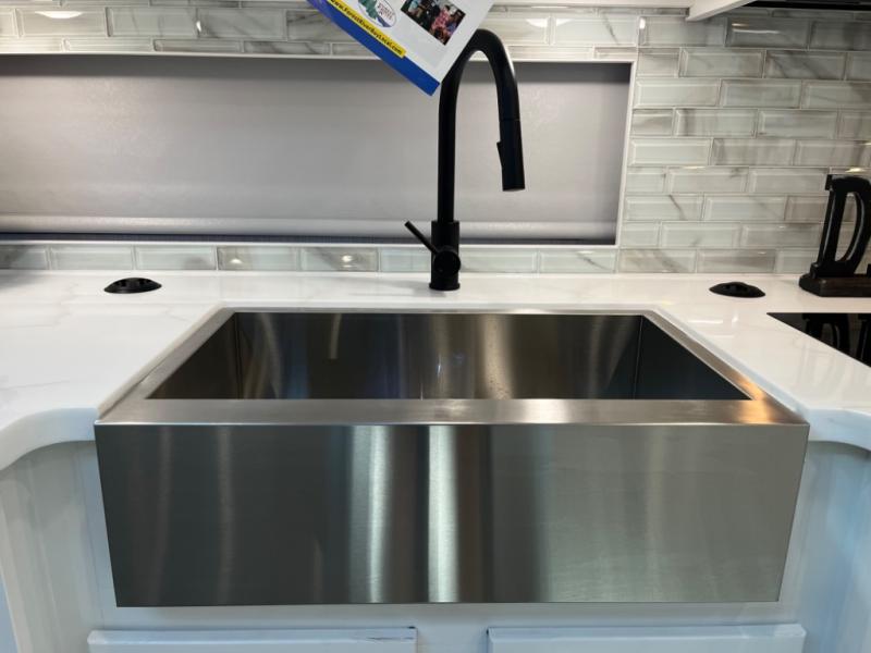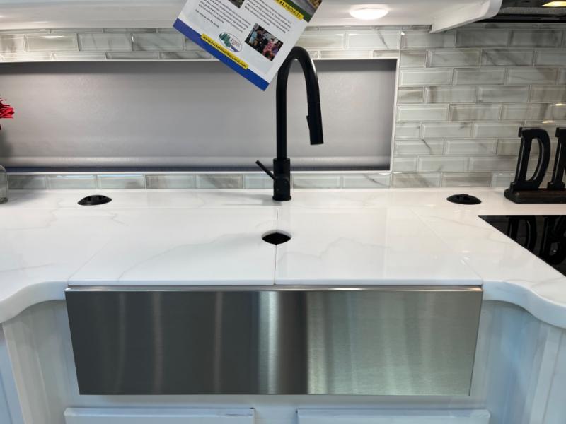 - Solid-surface countertops and deep-basin sink for easy meal prep and cleanup.