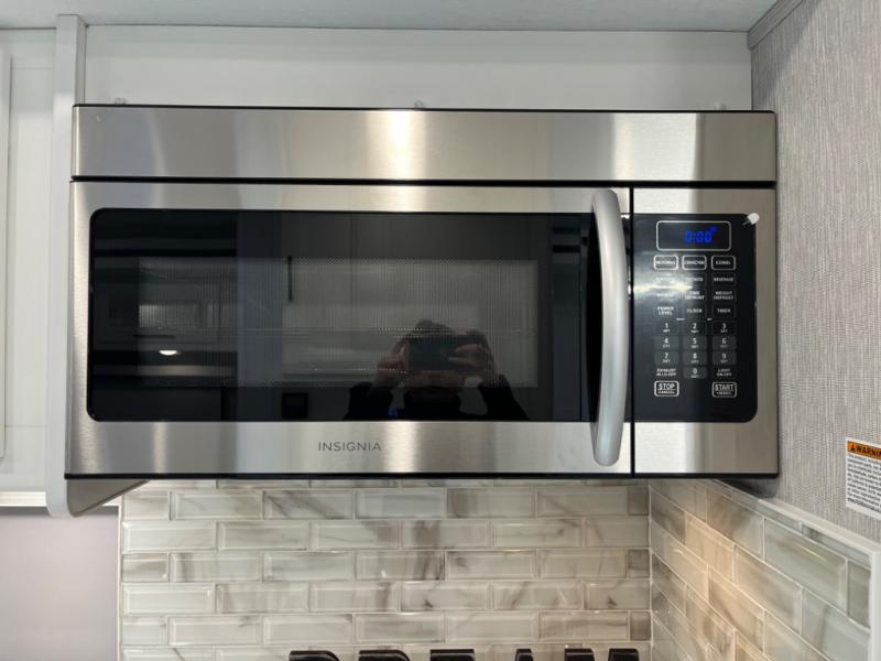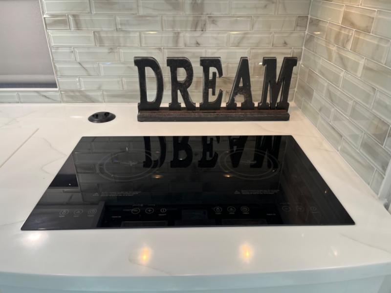 - Three-burner gas cooktop and convection microwave for gourmet meal preparation.