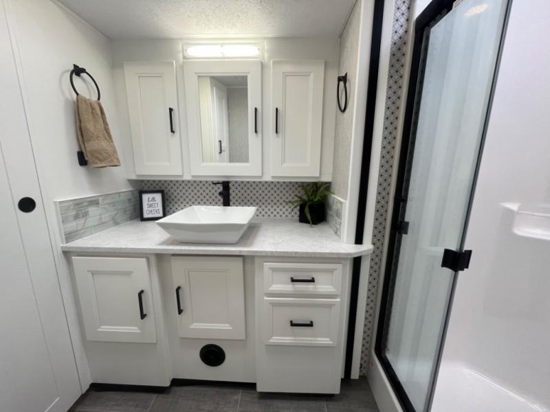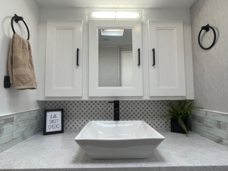 - Storage for toiletries, towels, and linens keeps everything organized.