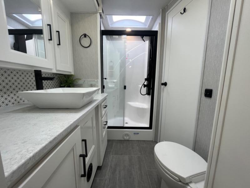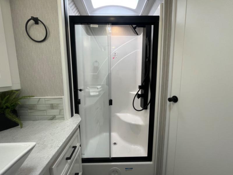- Full-size shower with glass doors and skylight for a spa-like experience.