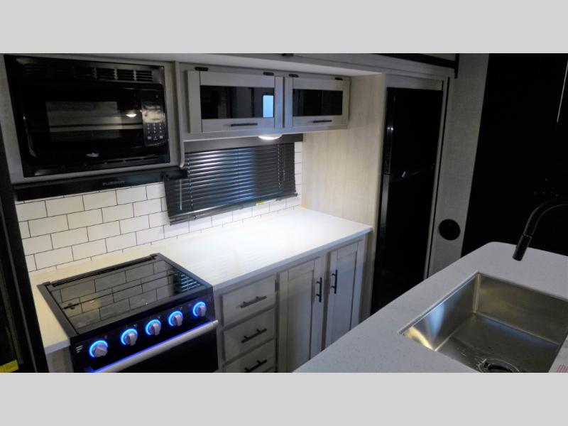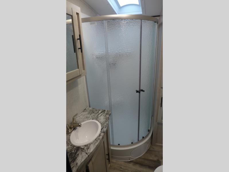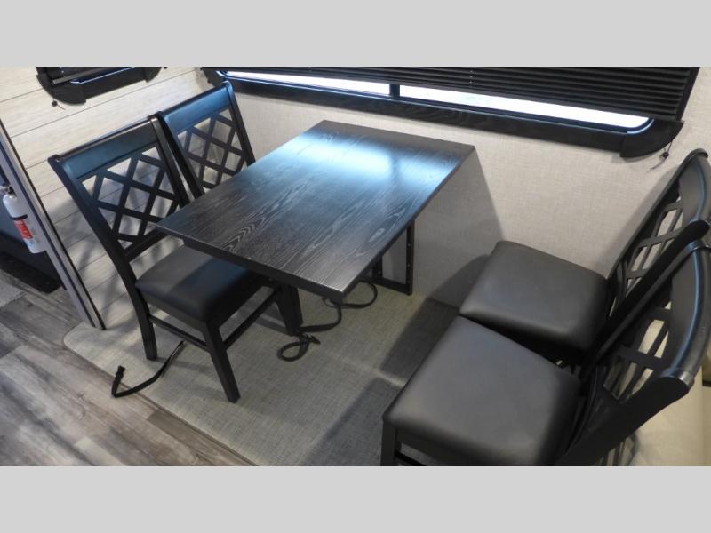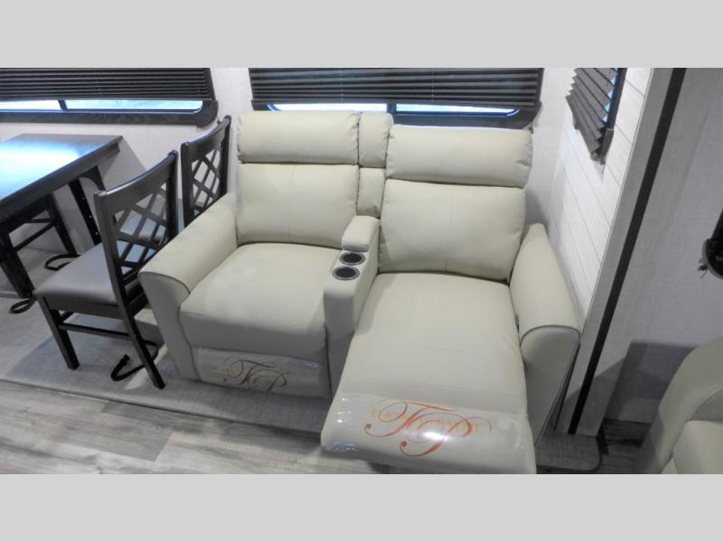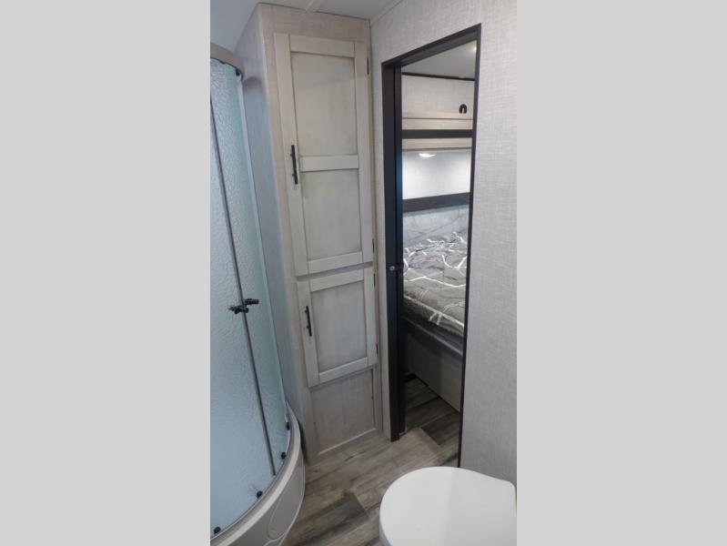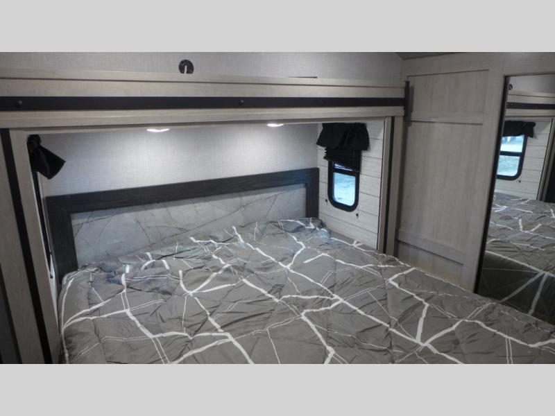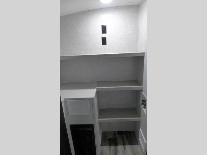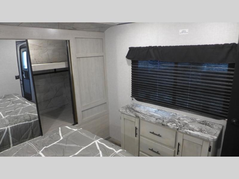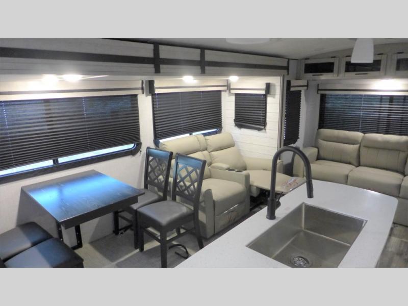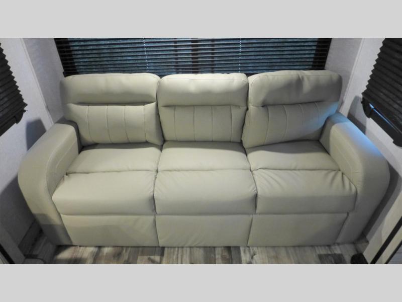 This spacious travel trailer is beaming with luxurious features you are sure to love. The dual opposing slides in the main living area open up the whole space, plus there is a third slide out in the front master suite. The chef of the family will appreciate the kitchen island for additional counter space, and there is a large pantry for all your non-perishables. This space has also been prepped to add an optional washer and dryer if you choose. Your family will find plenty of seating space on the rear 82" tri-fold sofa, the XL booth dinette, and the theater seating. The dual entry bath creates a front master bedroom, and you'll find plenty of storage space here, including a chest of drawers and a large front shelf!