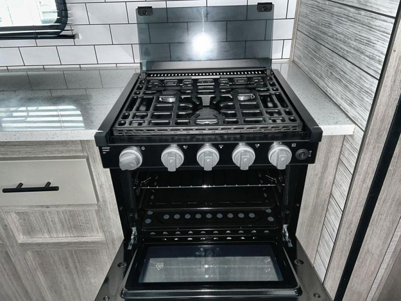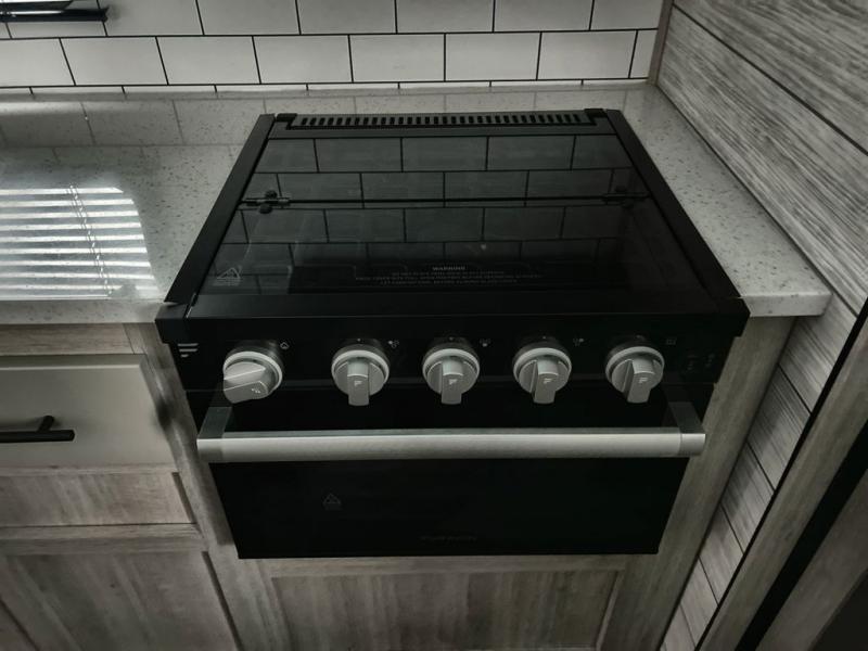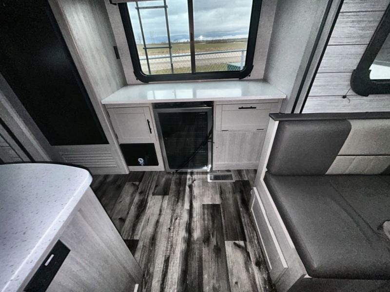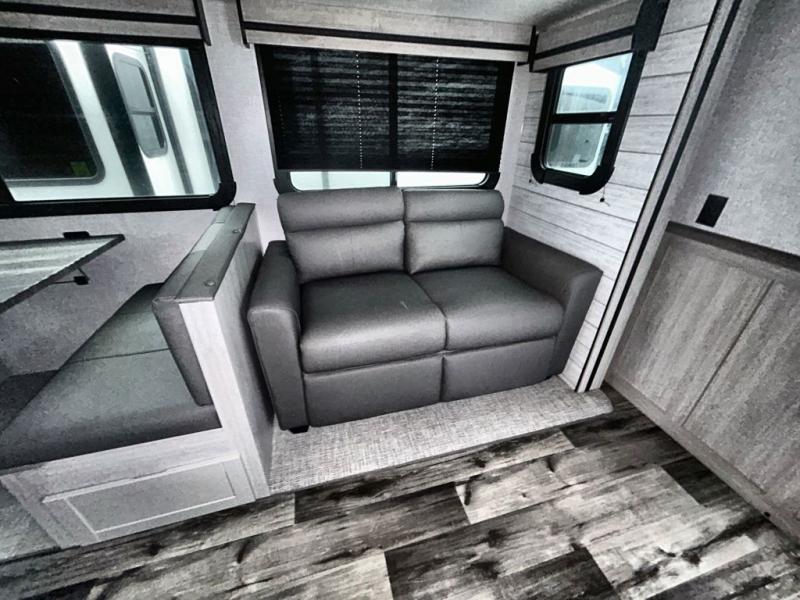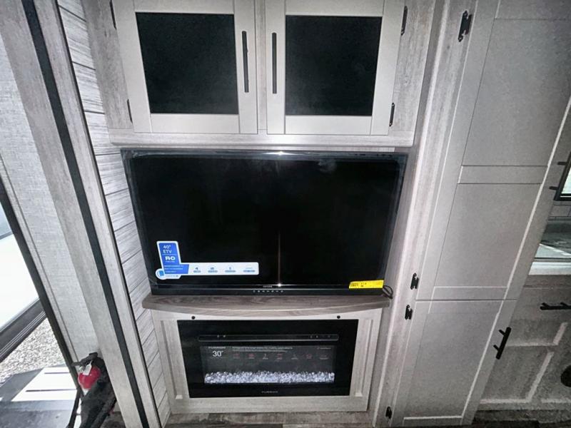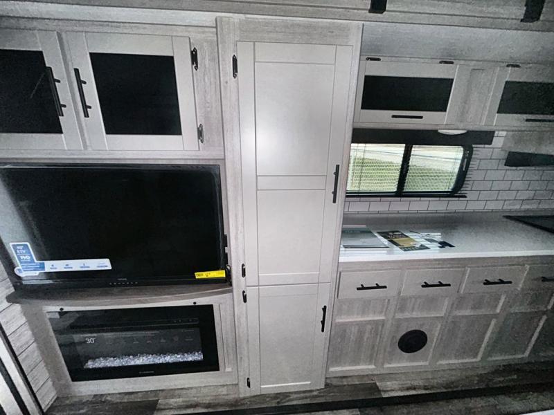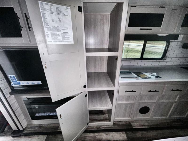 What could be more comfortable than a king bed, dual opposing slides for added space, plus an exterior camp kitchen? You will get all that and more when you choose this spacious travel trailer. The chef of the family will love the kitchen island for added space to cook and clean up, and there is plenty of rear counter space to set out fresh fruits and veggies. The tri-fold sofa sits directly across from the fireplace for a cozy evening indoors, and if you're not needing the extra sleeping space you can choose the optional theater seating in place of the tri-fold sofa. You will truly feel at home in the front private bedroom that includes a king bed, dual wardrobes, plus a third wardrobe in the closet. There is even a pet station that will make camping with your dog easier than ever!