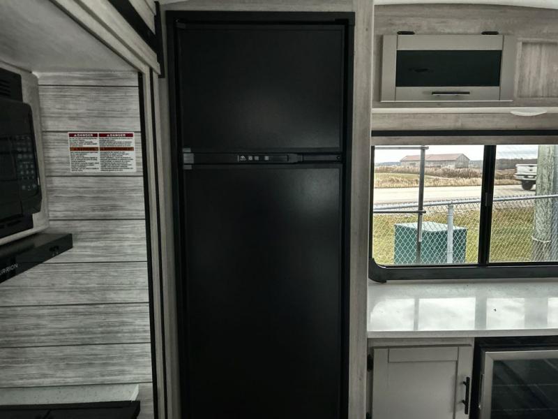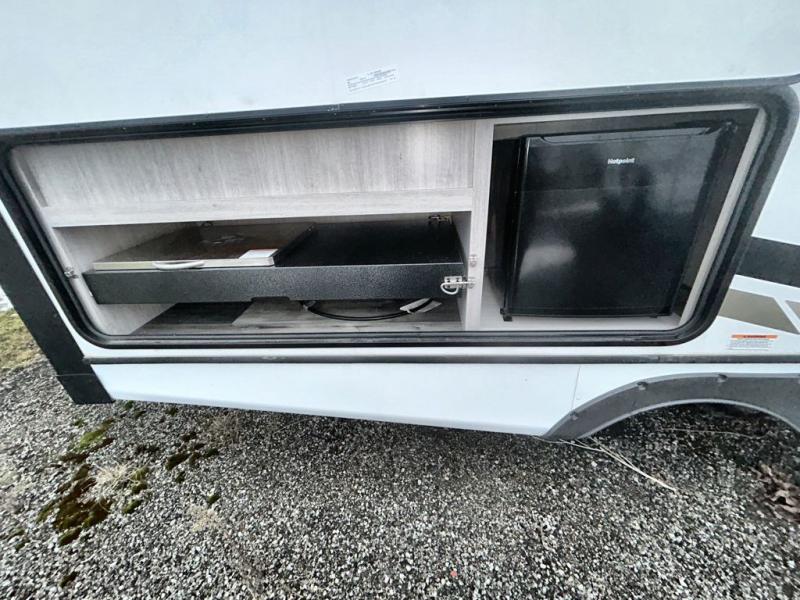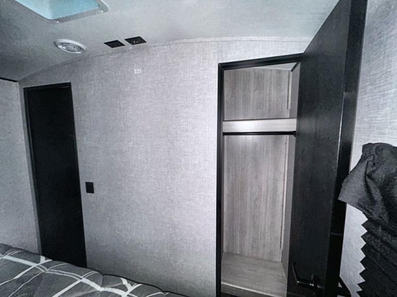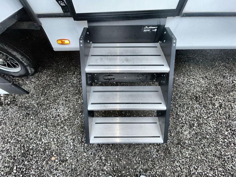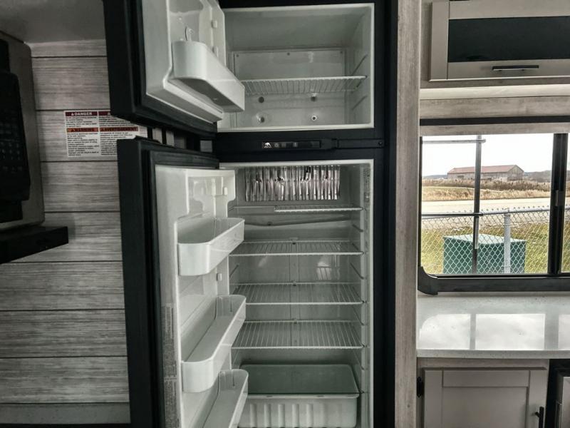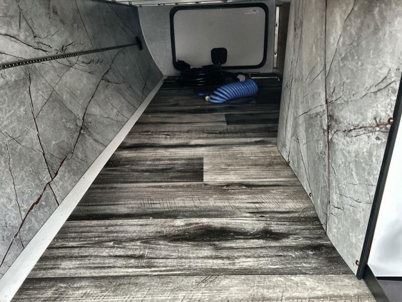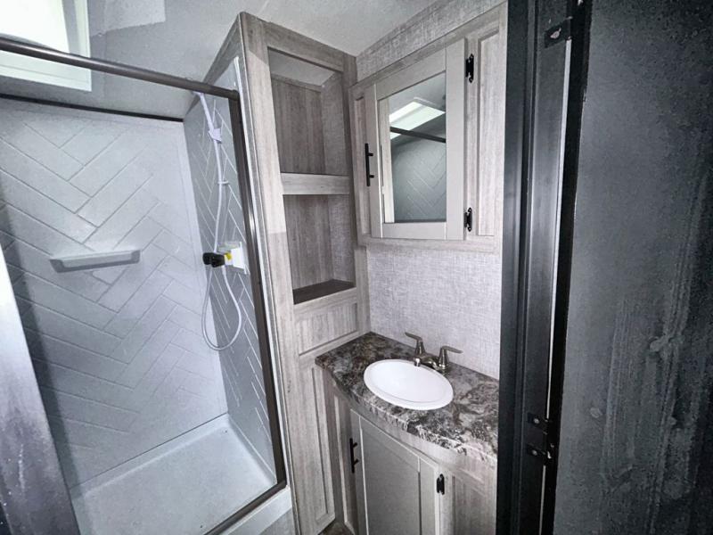 What could be more comfortable than a king bed, dual opposing slides for added space, plus an exterior camp kitchen? You will get all that and more when you choose this spacious travel trailer. The chef of the family will love the kitchen island for added space to cook and clean up, and there is plenty of rear counter space to set out fresh fruits and veggies. The tri-fold sofa sits directly across from the fireplace for a cozy evening indoors, and if you're not needing the extra sleeping space you can choose the optional theater seating in place of the tri-fold sofa. You will truly feel at home in the front private bedroom that includes a king bed, dual wardrobes, plus a third wardrobe in the closet. There is even a pet station that will make camping with your dog easier than ever!