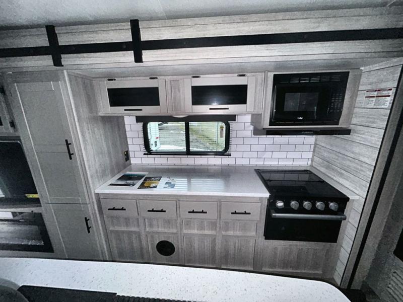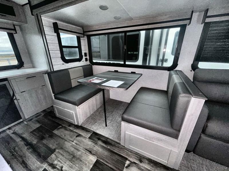 With any Sunset Trail travel trailer by CrossRoads RV, the interior offers a stainless steel farmhouse sink with a cover, solid surface kitchen countertops, and a docking station with 12 Volt, USB Port, and 110 Outlets. Also included is a 13,500 BTU air conditioner plus upgraded insulation with roof and floor reflective foil for added comfort, plus sturdy construction elements like a plywood bed board with strut assist, residential wood window trim, and hardwood cabinet doors. Make your lightweight and comfortable RV decision today!
