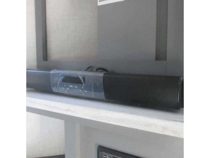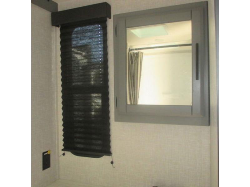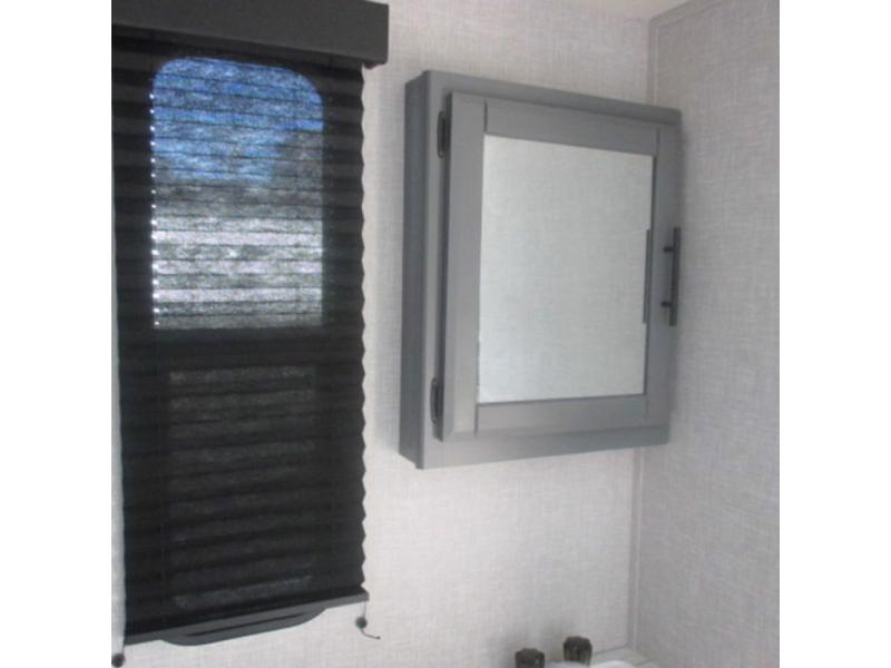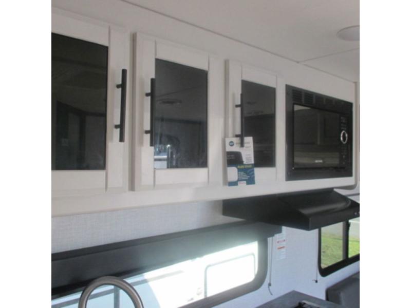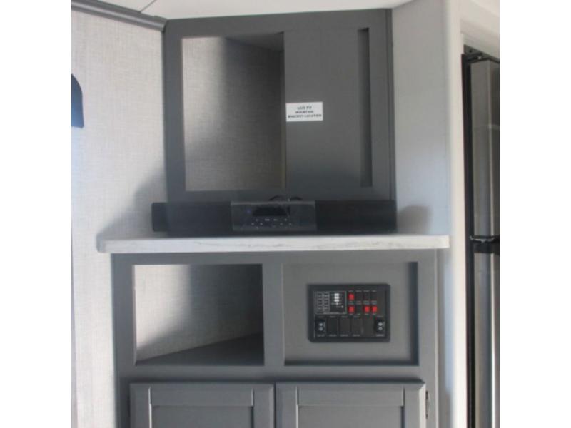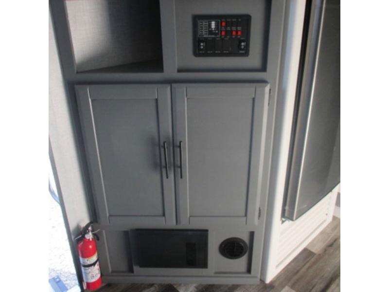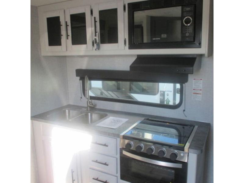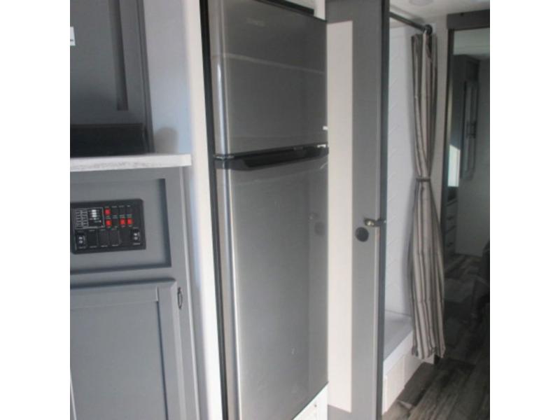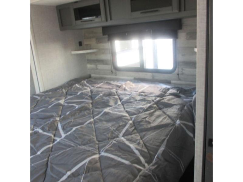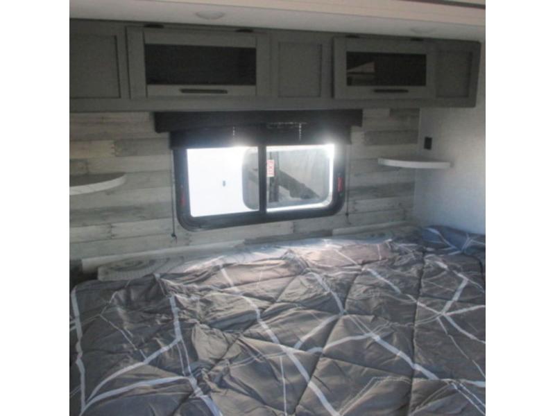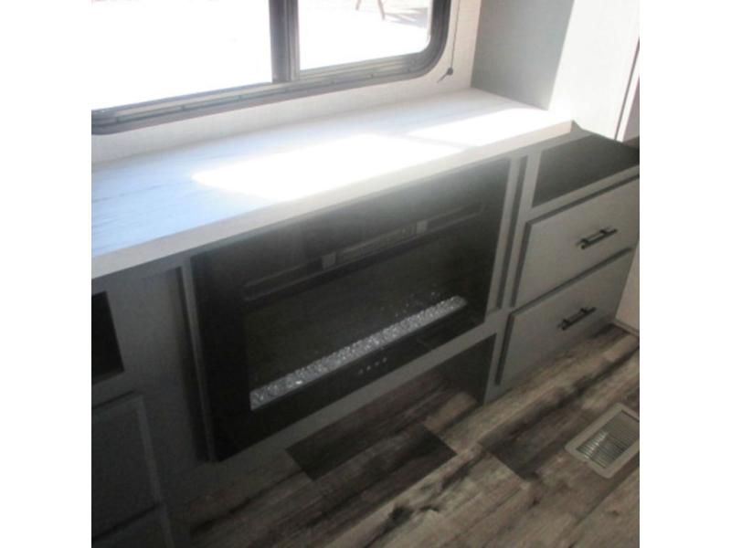 You will feel right at home in this travel trailer that can comfortably sleep four people each night between the king bed in the rear private bedroom and two on the 93" x 48" dinette in front once converted. Once you arrive at your destination, set up the power awning to create even more living space outside. You can then stretch your legs on a trail or two and easily clean up in the spacious walk-thru bath when you return. The chef will have all the appliances needed to create a home-cooked meal, and you can also be watching the 32" TV while you wait to eat. You'll love the rear private bedroom that includes a king bed, a fireplace, plus plenty of space to store your things in the dresser or wardrobes!