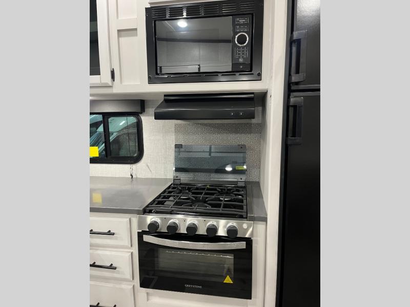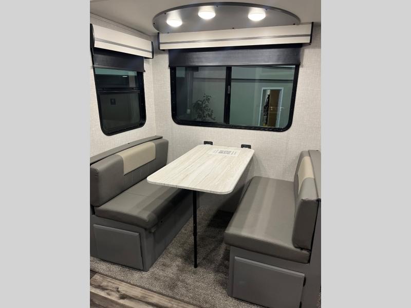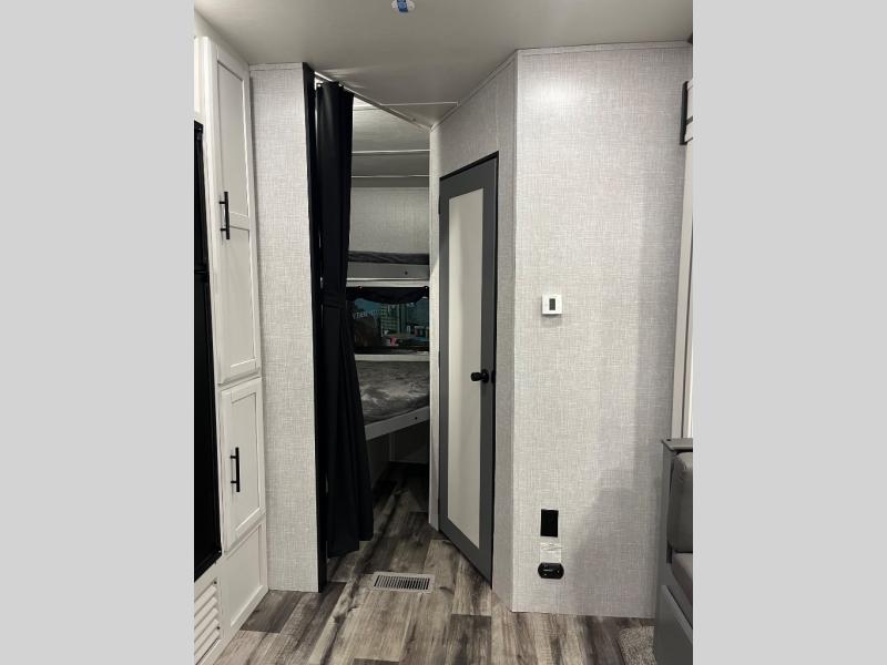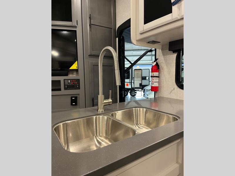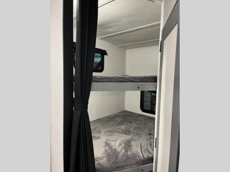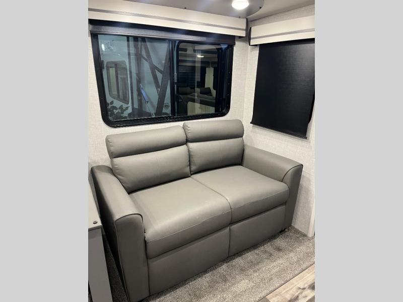 This is the perfect fifth wheel for a family or larger group since it can sleep nine people each night. The kids or your guests will love the double-size bunks, and the front private bedroom with a queen bed will be perfect for you and your spouse. Within the large slide out you'll find the tri-fold sofa and booth dinette where you can relax, play a game of cards, and convert to sleeping space at night. The chef of the family will love this kitchen with its solid-surface countertops, a 10 Cu. Ft. 12V refrigerator, plus a pantry for canned goods!