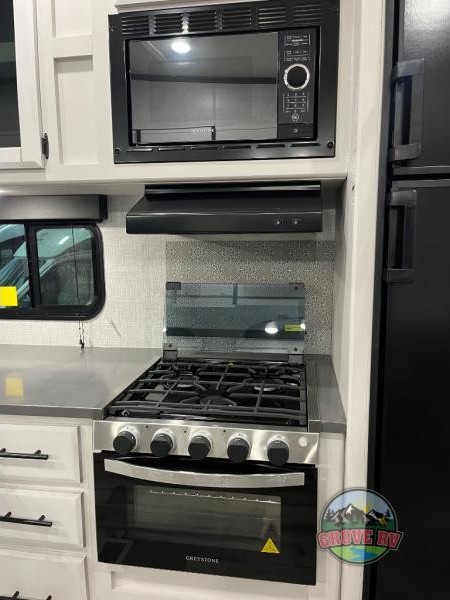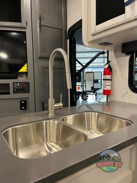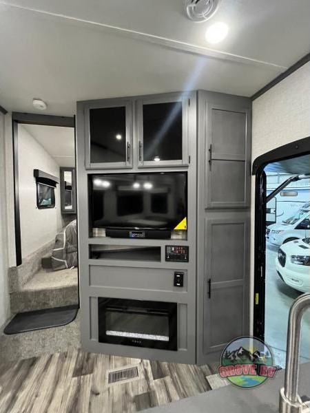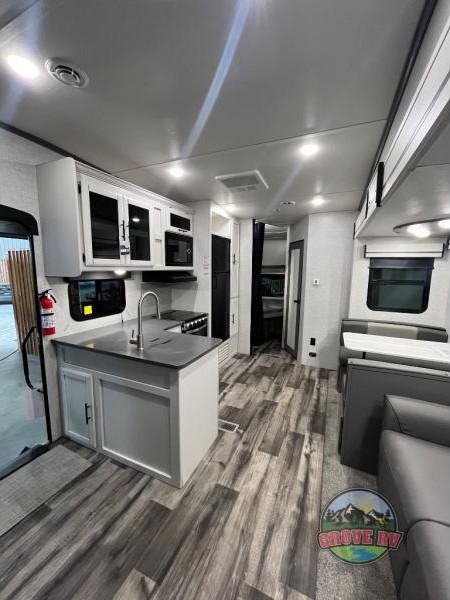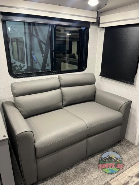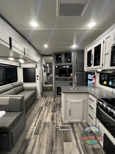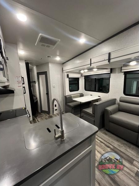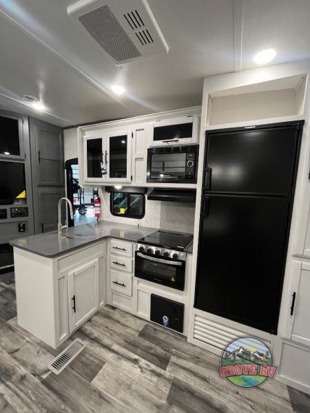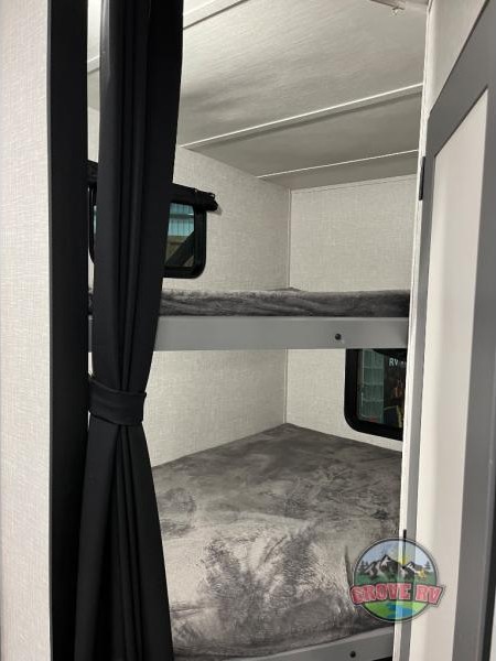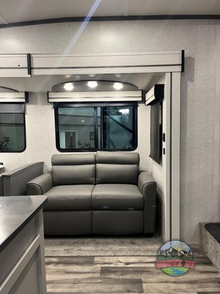 This is the perfect fifth wheel for a family or larger group since it can sleep nine people each night. The kids or your guests will love the double-size bunks, and the front private bedroom with a queen bed will be perfect for you and your spouse. Within the large slide out you'll find the tri-fold sofa and booth dinette where you can relax, play a game of cards, and convert to sleeping space at night. The chef of the family will love this kitchen with its solid-surface countertops, a 10 Cu. Ft. 12V refrigerator, plus a pantry for canned goods!