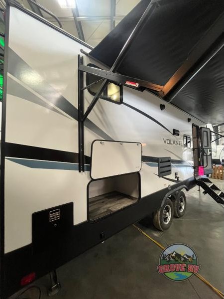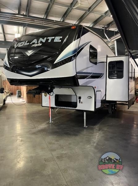 Each Volante fifth wheel or travel trailer by CrossRoads RV includes features and options that will enhance your camping experience. The fiberglass front cap is sure to be eye-catching, and you can plan to camp year around with the fully enclosed and forced air heated underbelly. There is also an outside shower, an electric awning with LED lights, outdoor speakers with LED accents, plus many more exterior conveniences. The interior of each Volante will have you feeling right at home with premium residential furniture, coordinating window treatments in the bedroom, nightstands with outlets in the bedroom, plus USB ports to keep your electronics charged. You will also appreciate a 13,500 BTU A/C, plus solar power prep and WiFi prep if you need to get some work done while you're away from home.