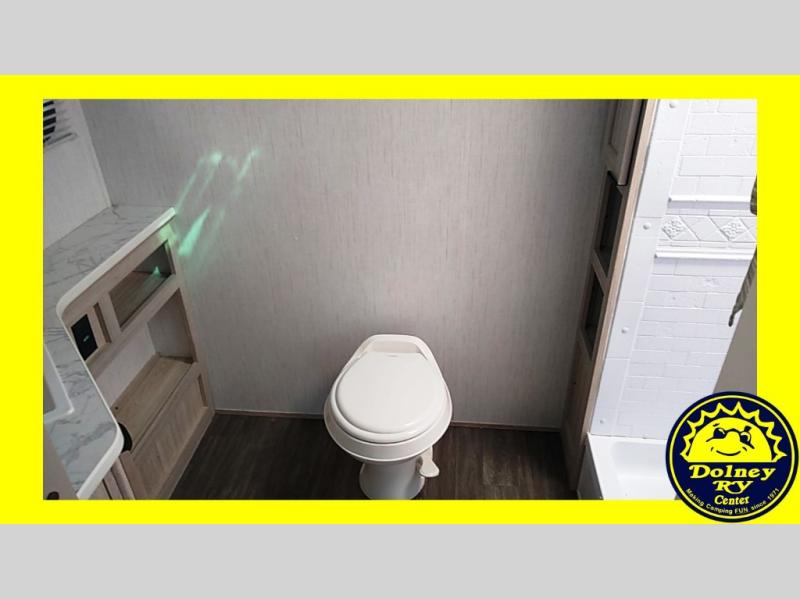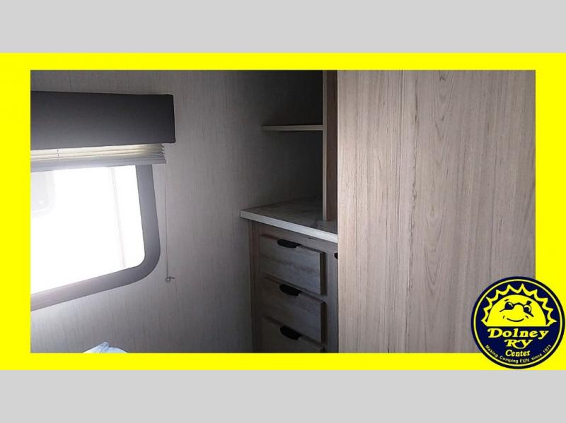Enjoy a relaxing vacation at the campgrounds with this travel trailer! The full rear bathroom has a full shower for you to rinse the sand out of your hair each day and extra countertop space to set your items. Your bellies will stay full with a walk-in pantry to store your canned goods and snacks, and a three burner cooktop to fry up some bacon. The sofa and booth dinette slide opens up the living/kitchen area while offering comfortable places to dine and socialize, plus they can even transform into extra sleeping spaces. The front private bedroom has a queen bed with wardrobes on either side so you can enjoy a good night's rest!