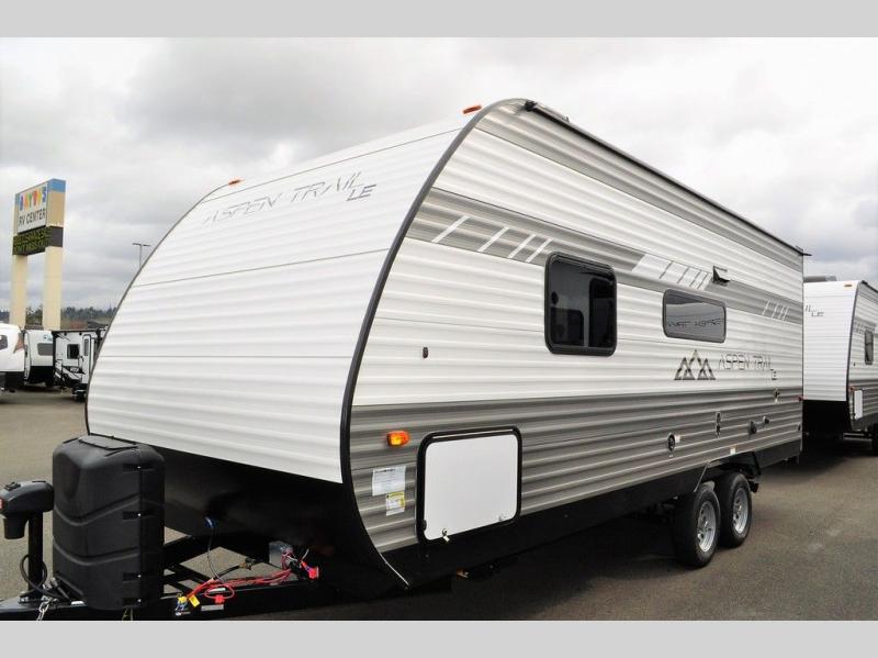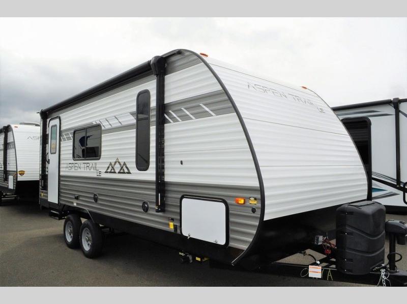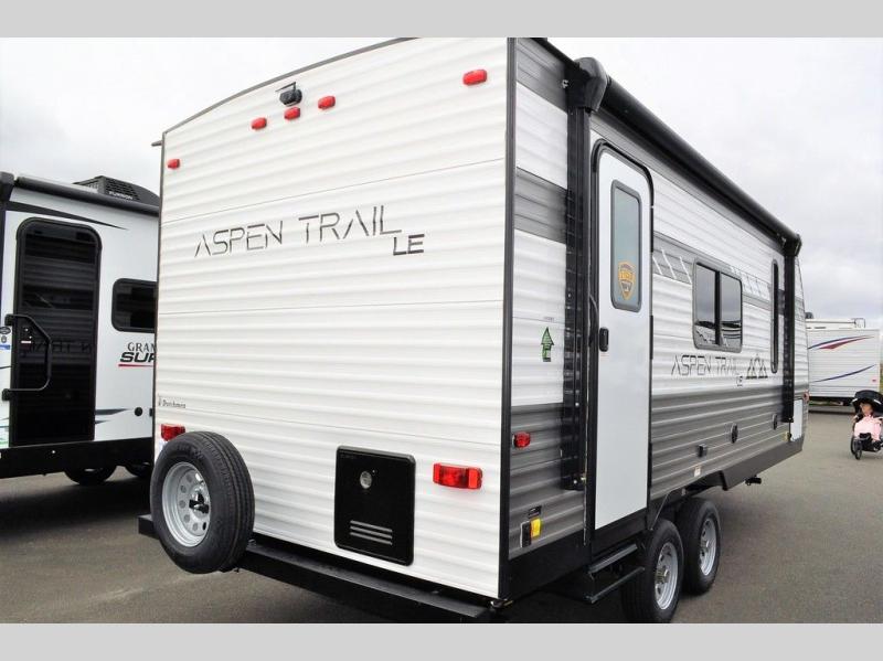 You will find more standard features and more value in each one of these Dutchmen RV Aspen Trail travel trailers! There is a smooth metal front end, diamond plate rock guard, a backup camera, plus many more exterior features. Experience all of the power with power stabilizers, a power awning, and a power tongue jack for easy setting up and breaking down. The fully enclosed underbelly provides an extra layer of protection for your unit's vitals so you can camp further into the year. With aluminum steps at the main entry, you will have a solid platform of stability as you enter and exit, plus they are easy to expand or store away. And the hardwood cabinetry throughout, roller shades, and seamless countertops will have you feeling right at home!